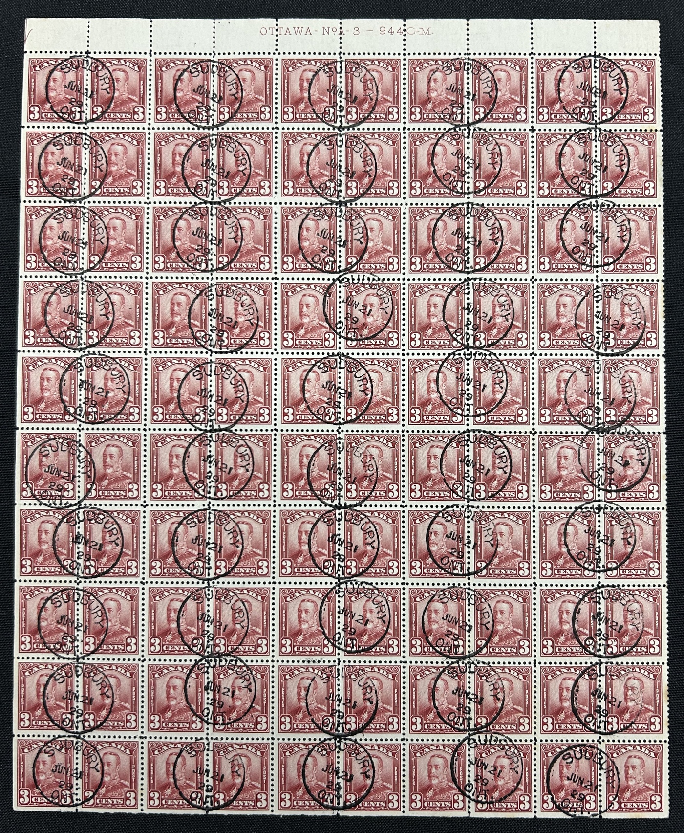 396 O 151 image1928 3c Dark Carmine King George V Scroll, a full sheet of 100 from the better A-3 plate, with full never hinged gum and 50 strikes of the Sudbury c.d.s. cancel dated JUN.21.1929. Bit of separation only, still a very fine and visually striking sheet of the best plate # of the "better" low denomination Scrolls.
