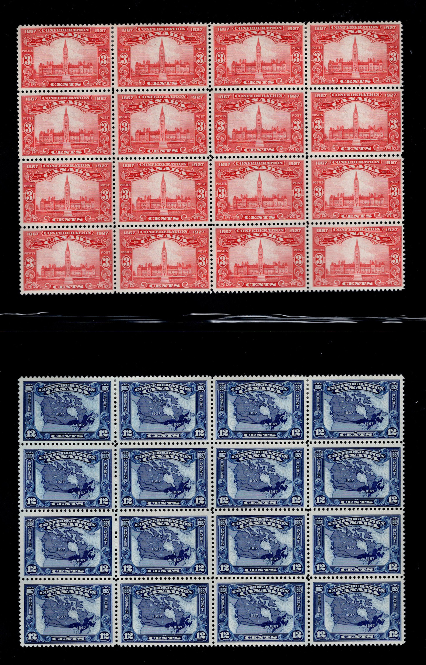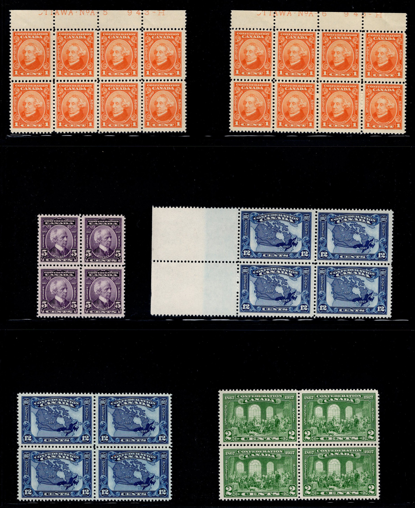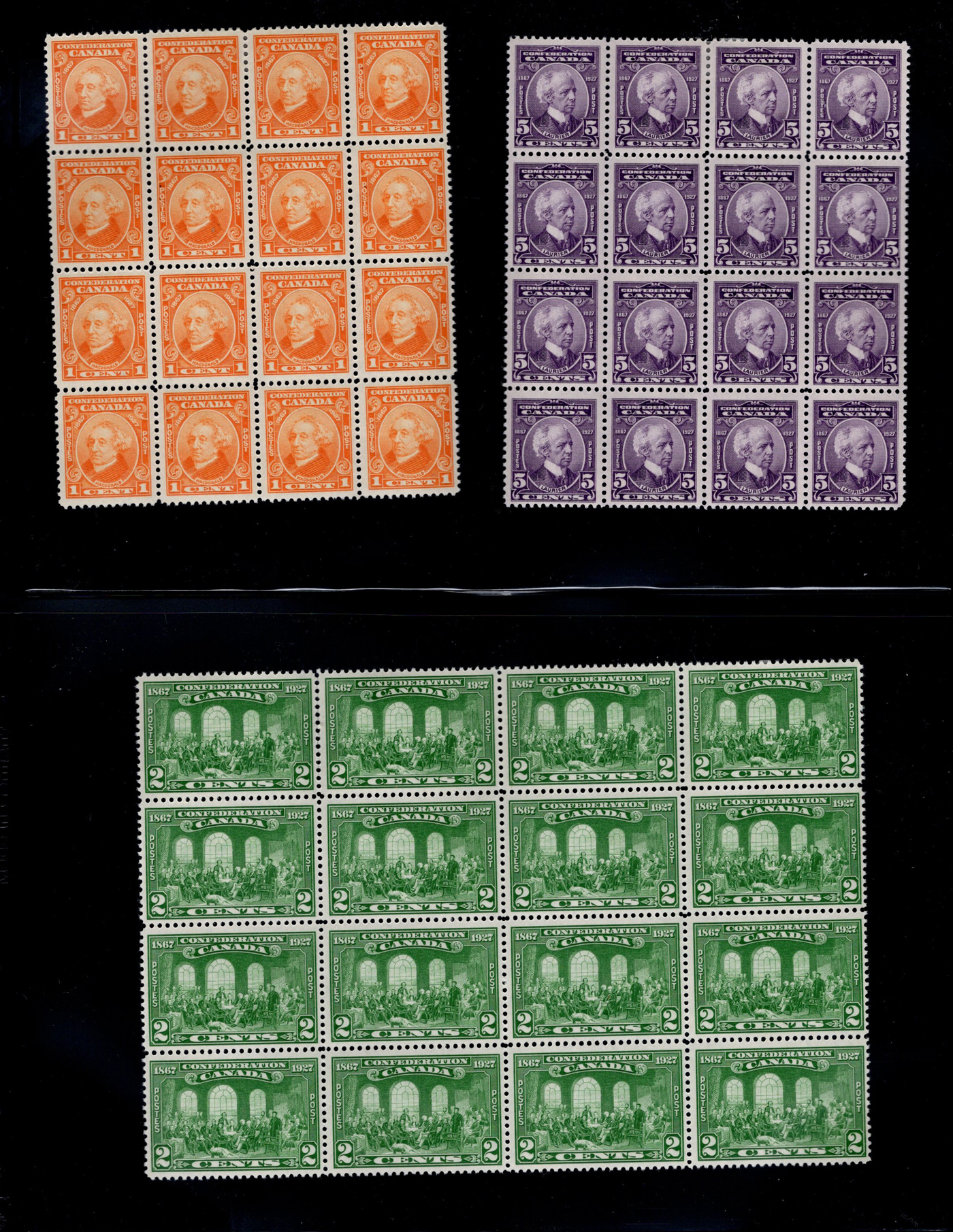 388 og/nh 141-145 image1927 1c to 12c Confederation Set, each value in a mint block of 16, the 1c, 2c and 5c each have two hinged stamps, the other values each have four hinged stamps, very fine. (Scan 1) (Scan 2) (All Scans)