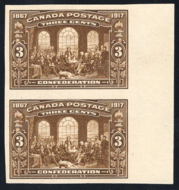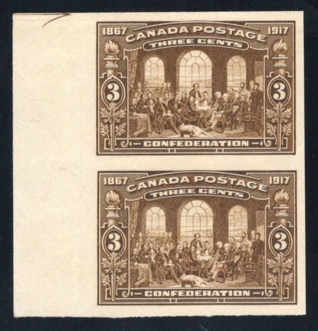 385 ng 135a image1917 3c Brown Confederation Imperforate, an unused (no gum, as issued) vertical pair with sheet margin at left and cutting arrow at top left, very fine.