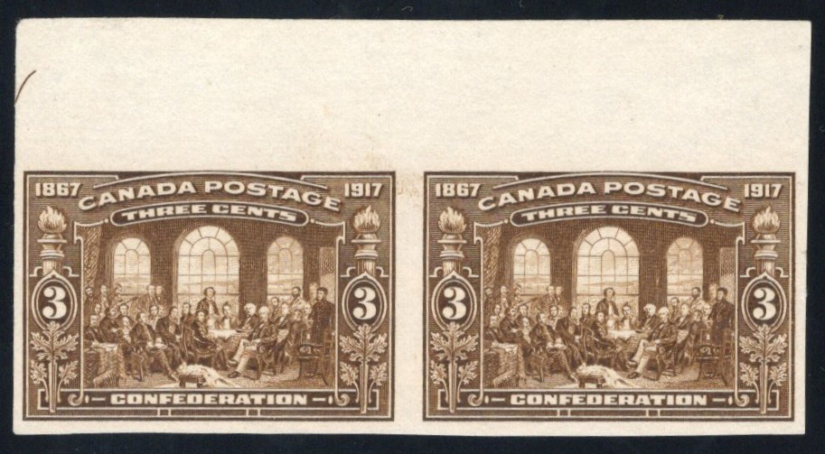 387 ng 135a image1917 3c Brown Confederation Imperforate, an unused (no gum, as issued) vertical pair with sheet margin at top and cutting arrow at top left, very fine.