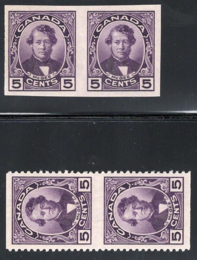 392 nh 146a, 146c image1927 5c Violet Thomas D'Arcy McGee Imperforate and Part Imperforate, both mint never hinged pairs, very fine.