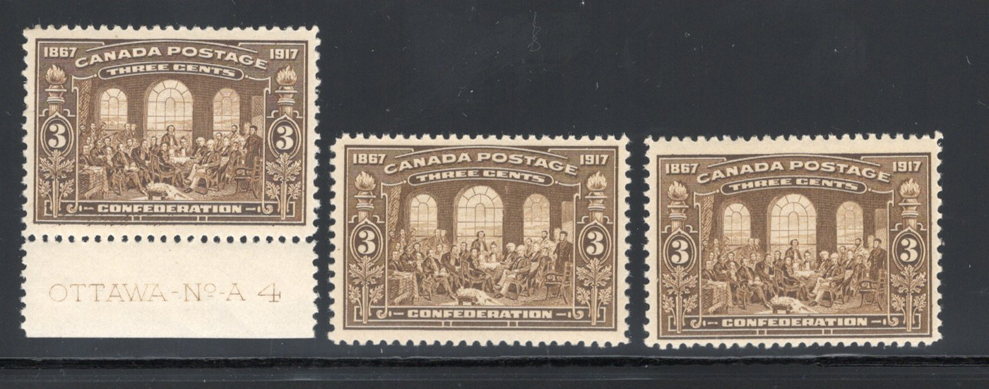 384 og/nh 135 image1917 3c Brown Confederation, three mint singles, one with sheet margin at bottom showing plate 4 inscription (very fine hinged), as well as a very fine never hinged and a fine never hinged. A fresh group.