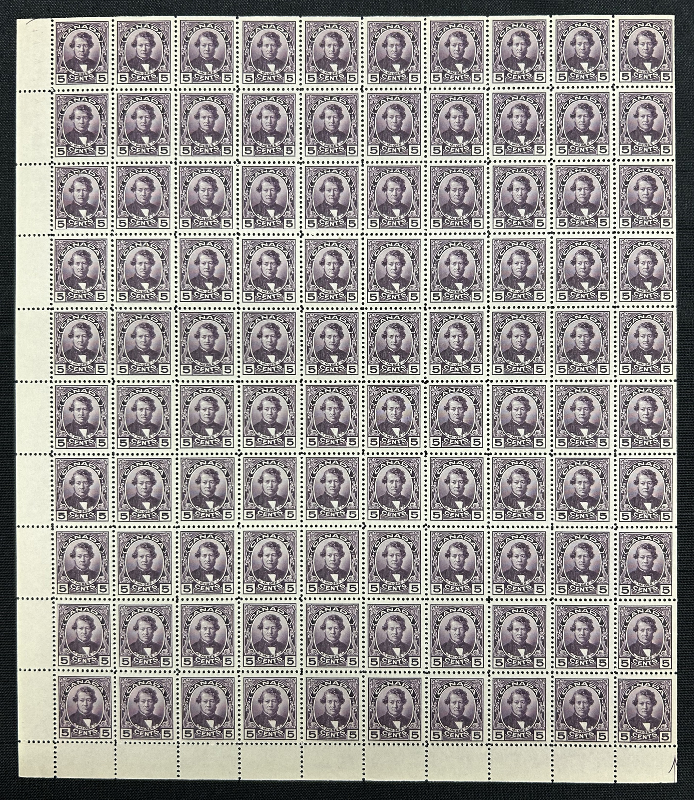 391 nh 146 image1927 5c Violet Thomas D'Arcy McGee, a mint never hinged full sheet of 100, with cutting arrows at UL and LR, quite fresh with no evidence of folding, very fine and scarce in sheet format.