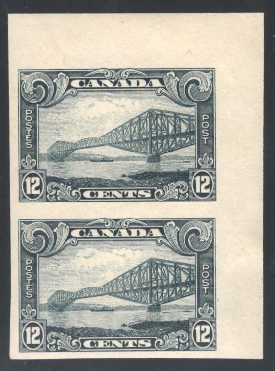399 nh 156a image1929 12c Grey Québec Bridge Imperforate, a mint never hinged horizontal pair, from upper right corner of the sheet, the bottom stamp has very light gum disturbance, still very fine.