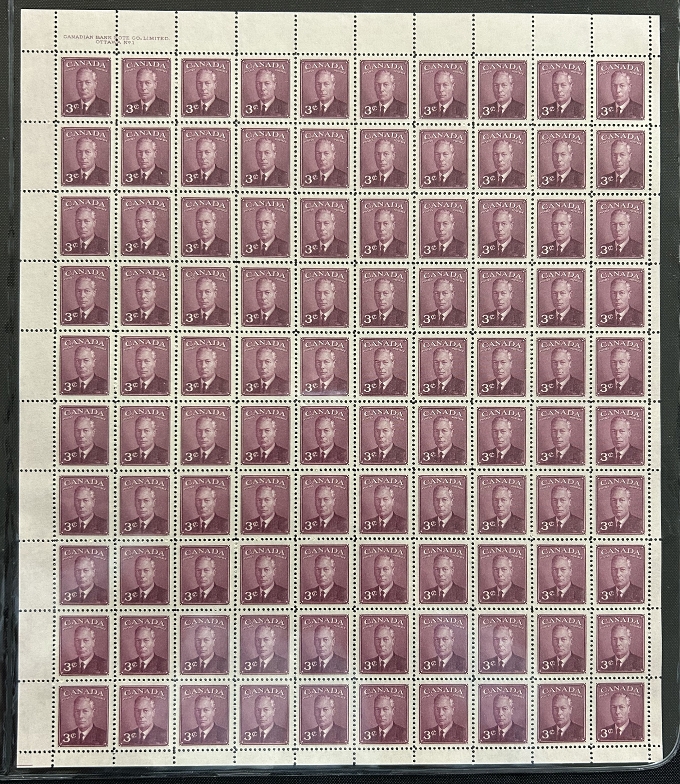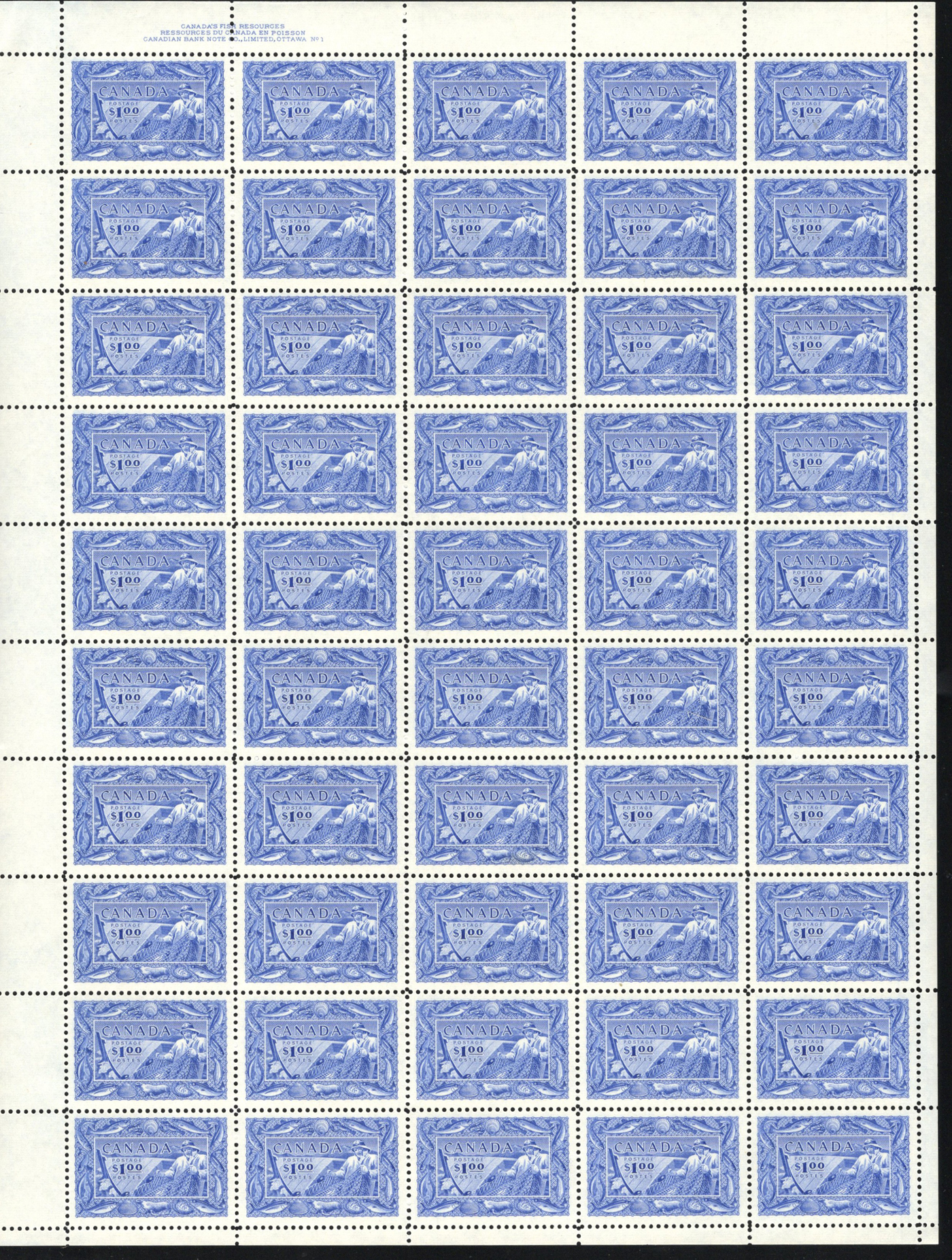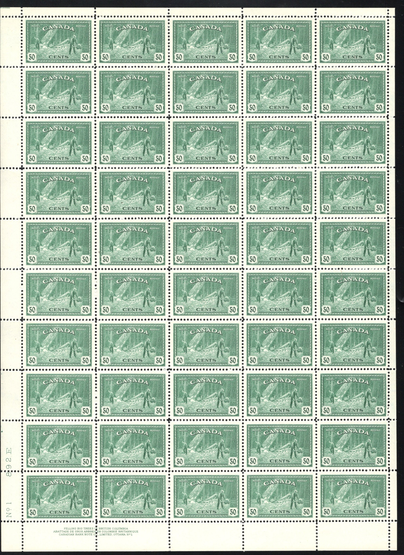 Green Logging in BC, a mint never hinged full sheet of 100, with plate 1 inscription at lower left. A fresh sheet, showing no evidence of having been folded, bit of separation at bottom, very fine.