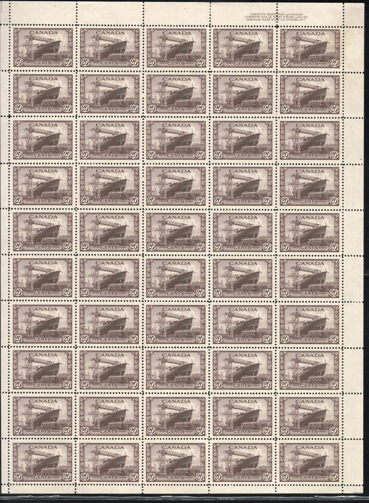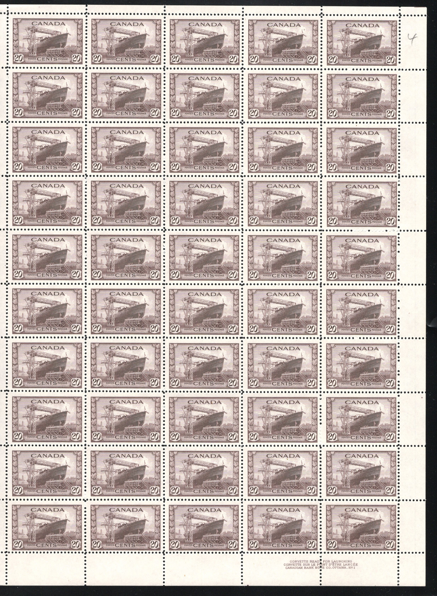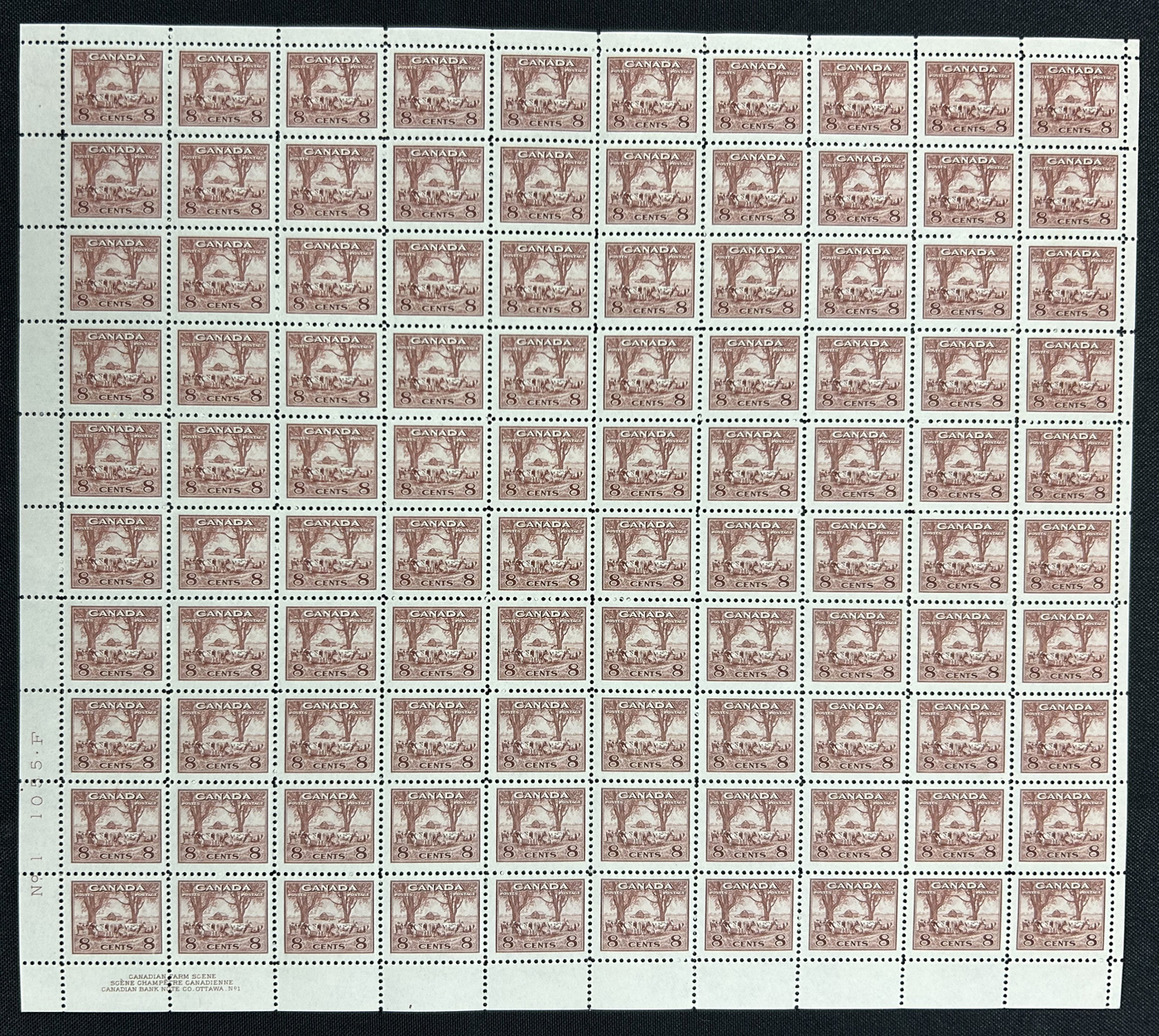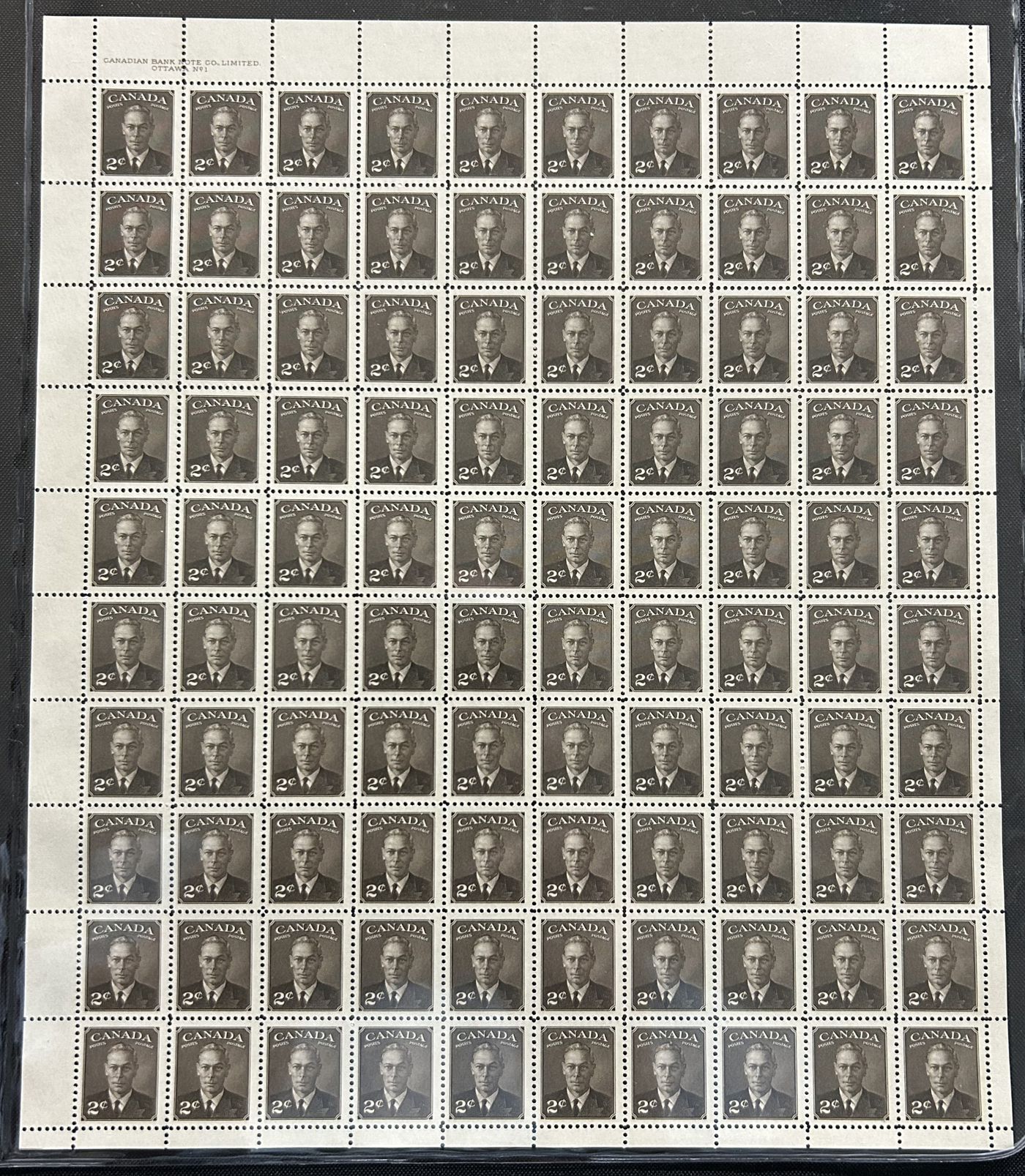 Green Logging in BC, a mint never hinged full sheet of 100, with plate 1 inscription at lower left. A fresh sheet, showing no evidence of having been folded, bit of separation at bottom, very fine.