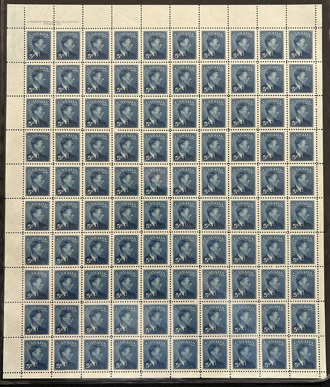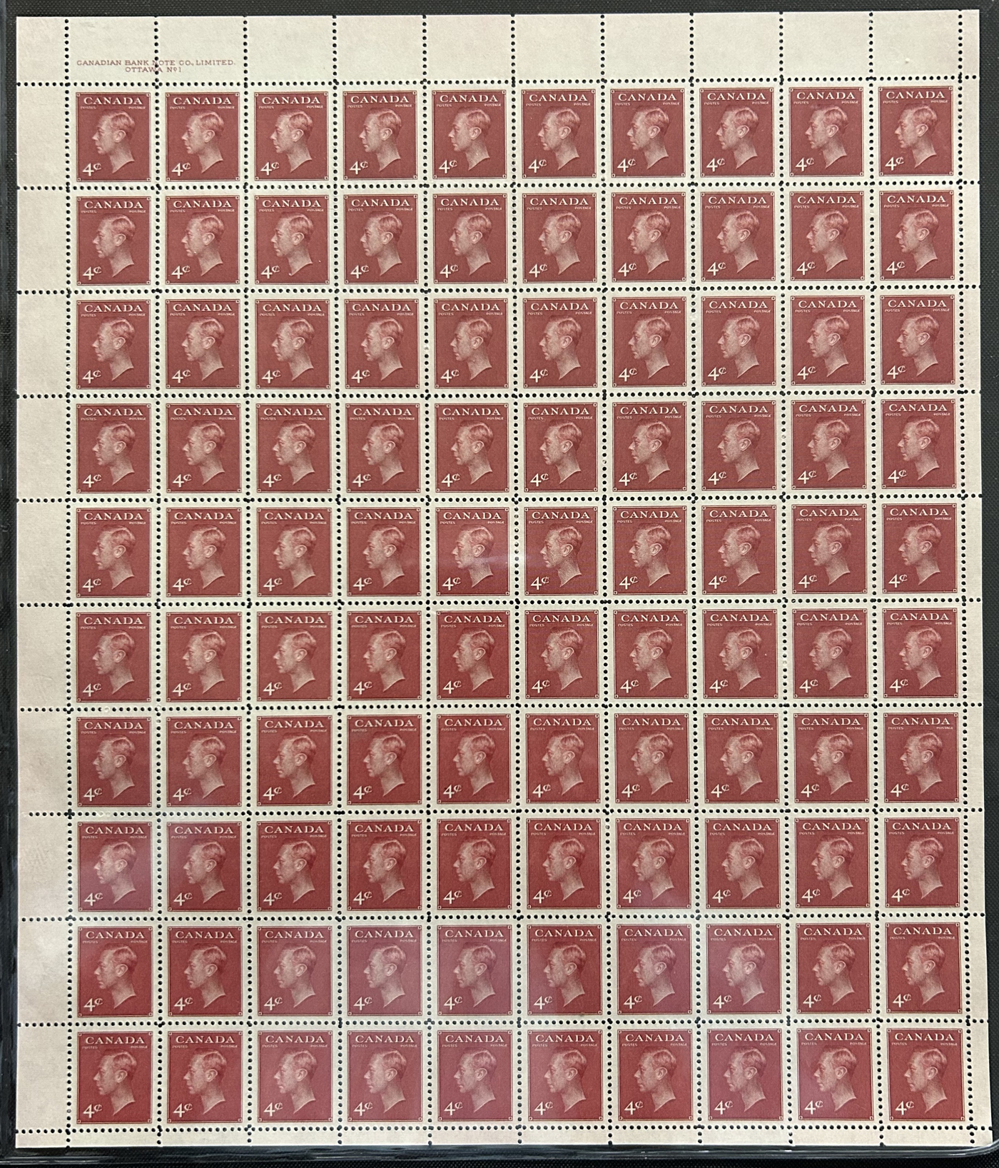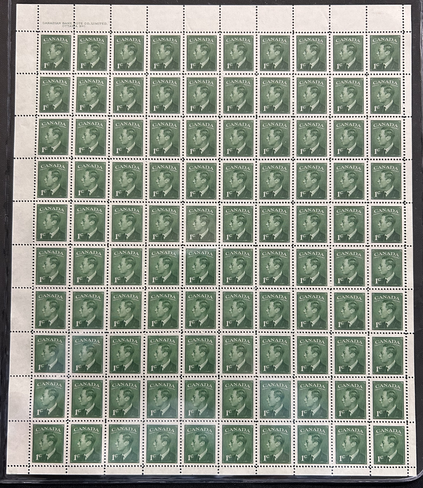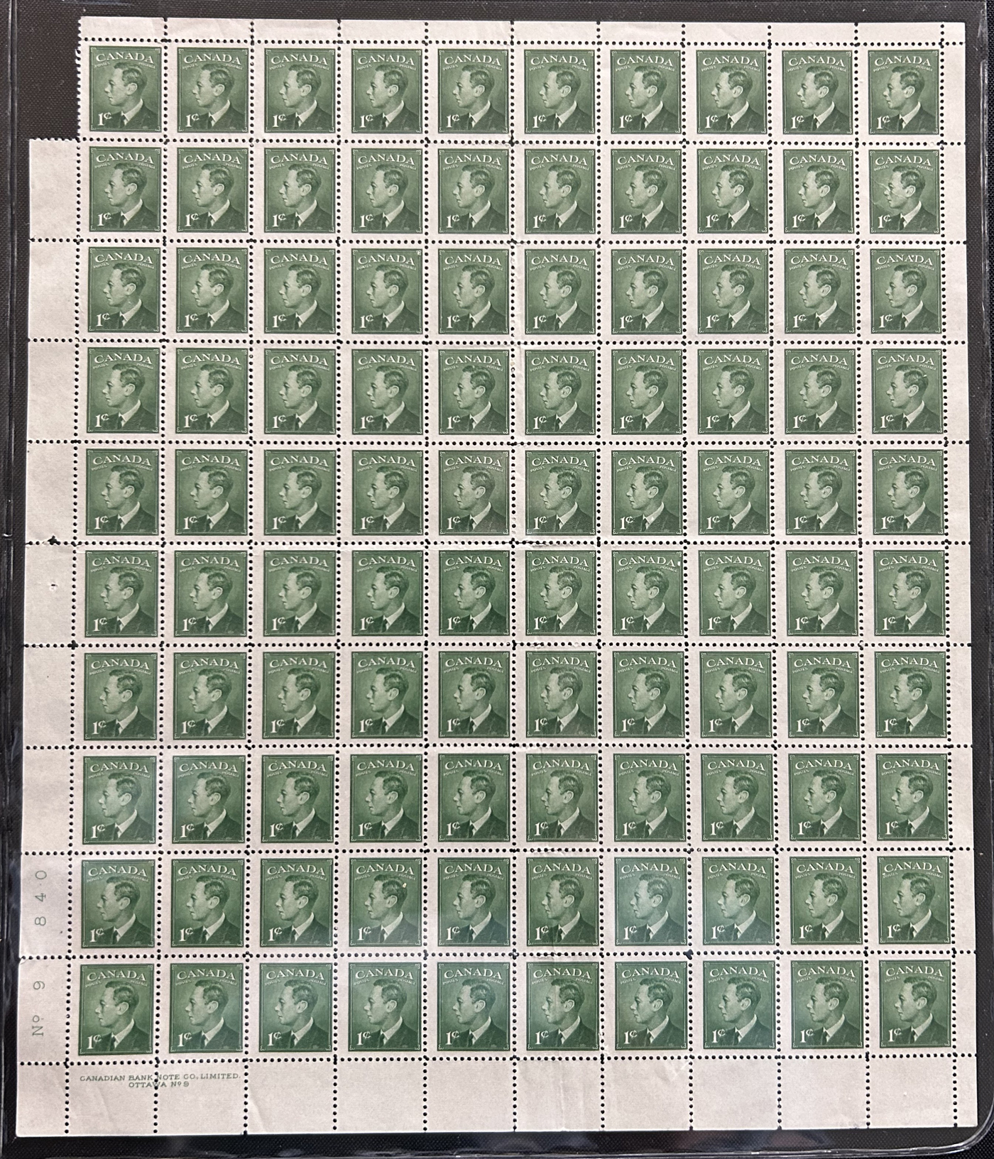 George VI "Postes - Postage" Set, a mint never hinged full sheet of 100 of each value, with plate 1 inscription at upper left on each sheet. A fresh and very fine group. Also includes an extra sheet of the 1c, with plate 9 inscription at lower