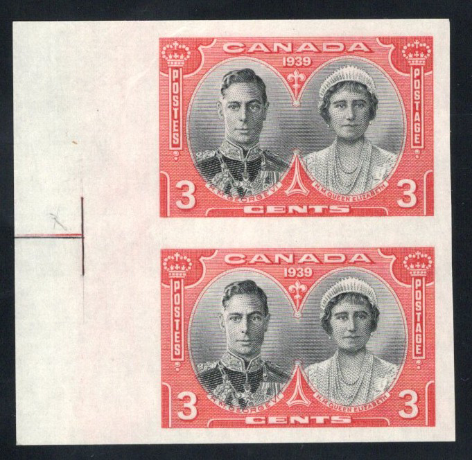 and Black King George VI and Queen Elizabeth Imperforate, a mint never hinged vertical pair, with sheet margin at left showing centering guidelines, very fine.