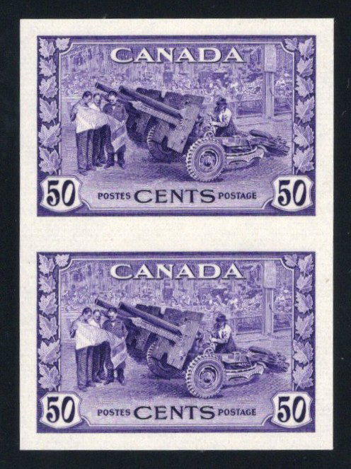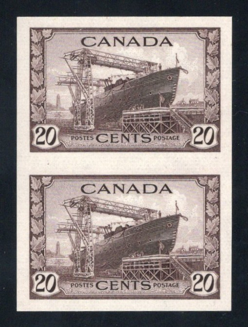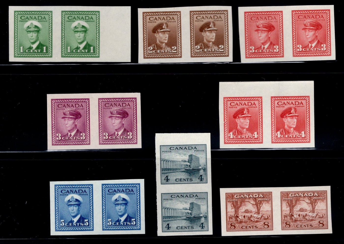 King George VI War Short Set, Imperforate, with all 8 values in horizontal pairs (the 4c Grain Elevators in vertical) with three values having sheet margins, #s 250a, 251b and 256a are lightly hinged, rest are never hinged, a very fine short set.