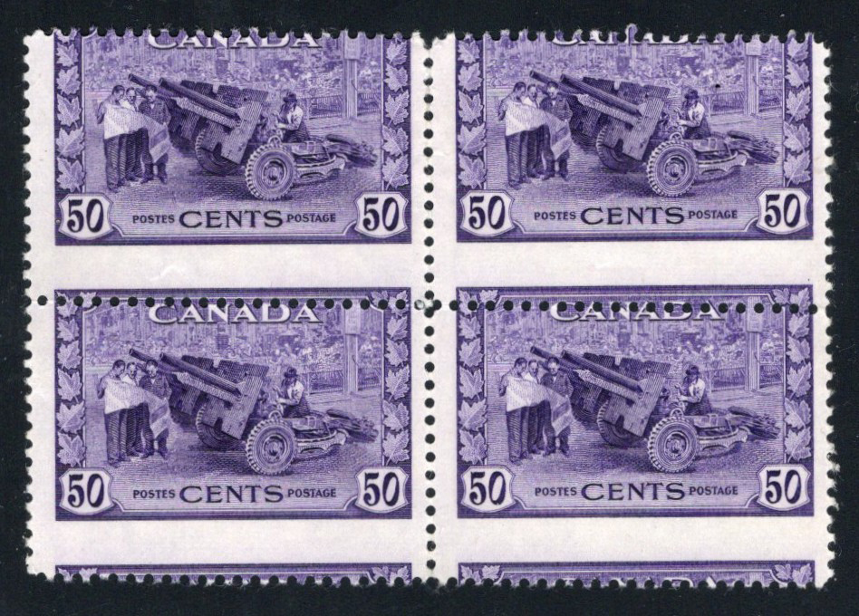 Munitions Factory, with Perforations Dramatically Shifted, a mint block of four (top lightly hinged, bottom never hinged) with the horizontal perforations shifted down and diagonally, showing parts of two other stamps at bottom, very fine and a