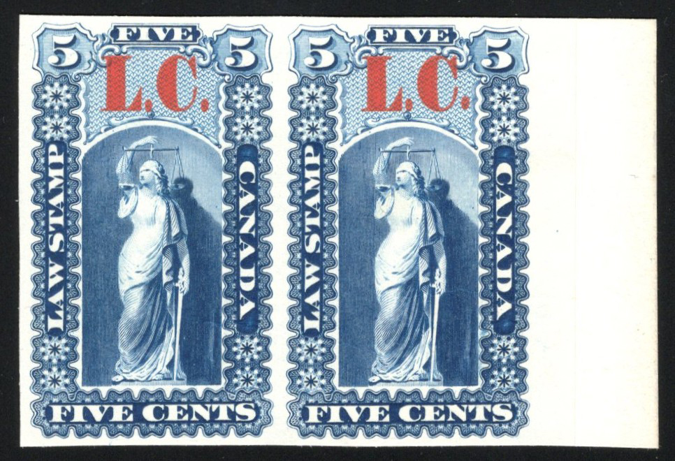623 E/P   image1864 5c Law Stamp with "L.C." Overprint Plate Proof Essay in Blue, a horizontal pair on card-mounted India paper with sheet margin at right, very fine. This value was not issued in Lower Canada.