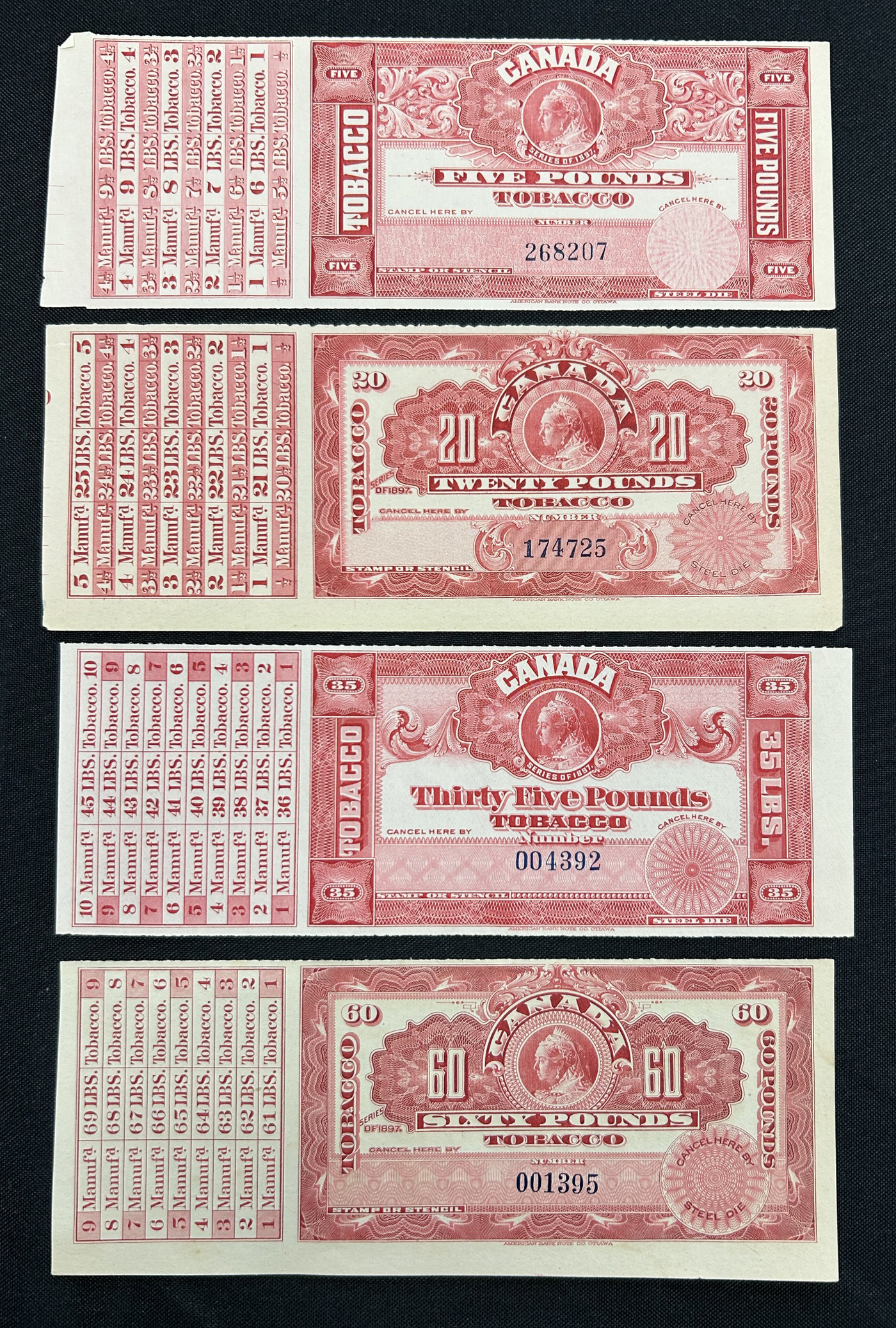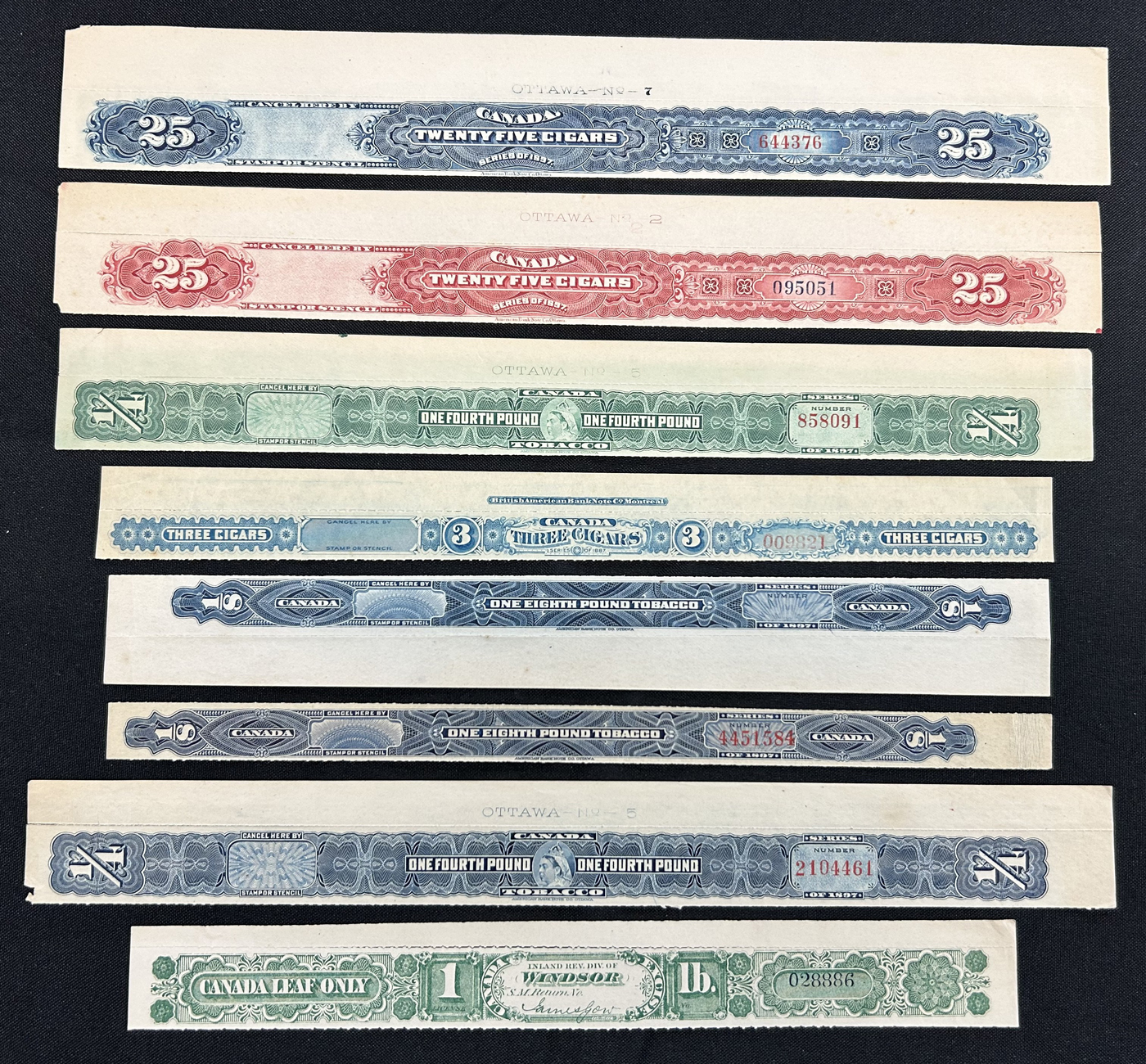 637 ng   imageGroup of Early Cigar and Tobacco Stamps, starts with 4 different 1897 Queen Victoria Tobacco stamps (20lb to 60lb) with all of their stubs still attached. Also 8 different "long strips" of tobacco / leaf / cigar stamps, all but one with top or bottom sheet margin, 6 of those with plate imprints. A very fine group. (Scan 1) (Scan 2) (All Scans)