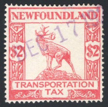 629 O NFT2 image1927 $2 Red Newfoundland Transportation Tex Stamp, used with handstamp of the date used, very fine and rare, with only 13 stamps known (6 mint and 7 used). Walsh TT2, U$3,575 (this particular stamp pictured in their census),