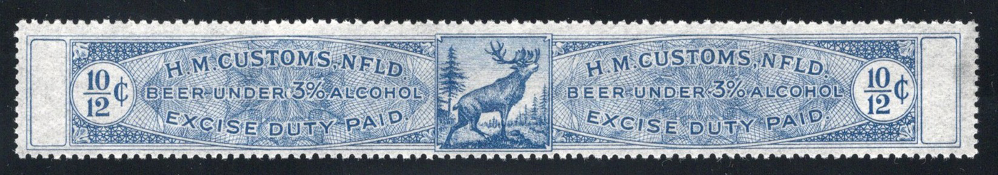 625 ng NFB1 image1938 10/12c Blue Beer Stamp, Perforated 12 x 13¼, unused (no gum, as issued), fresh and very fine. A wonderful example of one of the most beautiful revenue stamps. Walsh CD6, U$1,275.