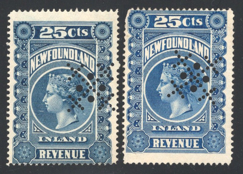 626 O NFR3 var image1898 25c Blue and Dark Blue Inland Revenue Stamps, both used, with the scarce (80 known) Supreme Court "Snowflake" cancel, fine. Walsh R3b, U$700.