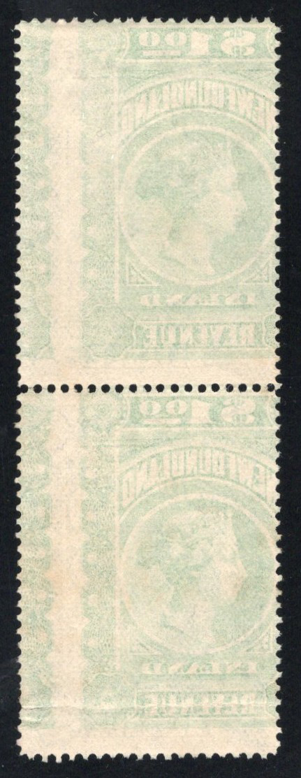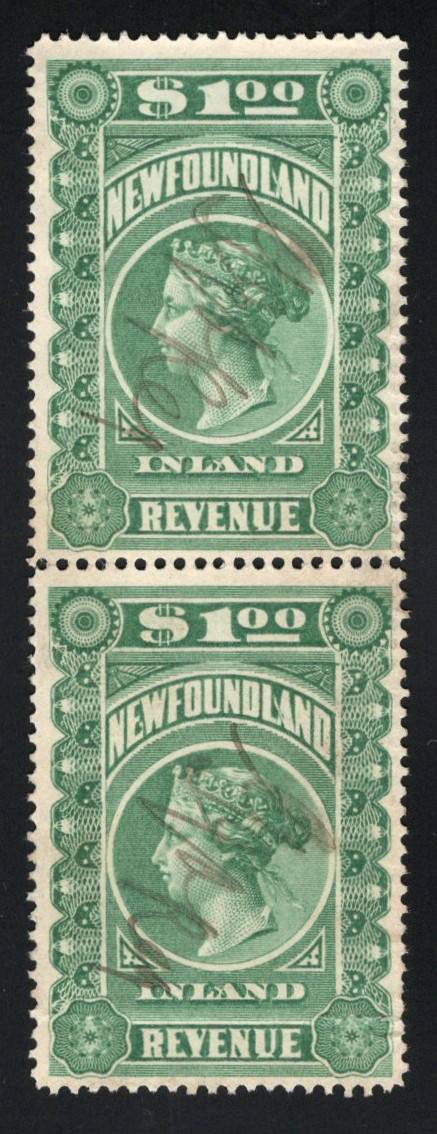 627 O NFR6a image1898 $1 Green Inland Revenue with Heavy Offset on Reverse, a used vertical pair with manuscript cancel, showing a strong offset, fine. Pairs are scarce, even more so with the offset. Walsh R6b, U$340. (Scan 1) (Scan 2) (All Scans)