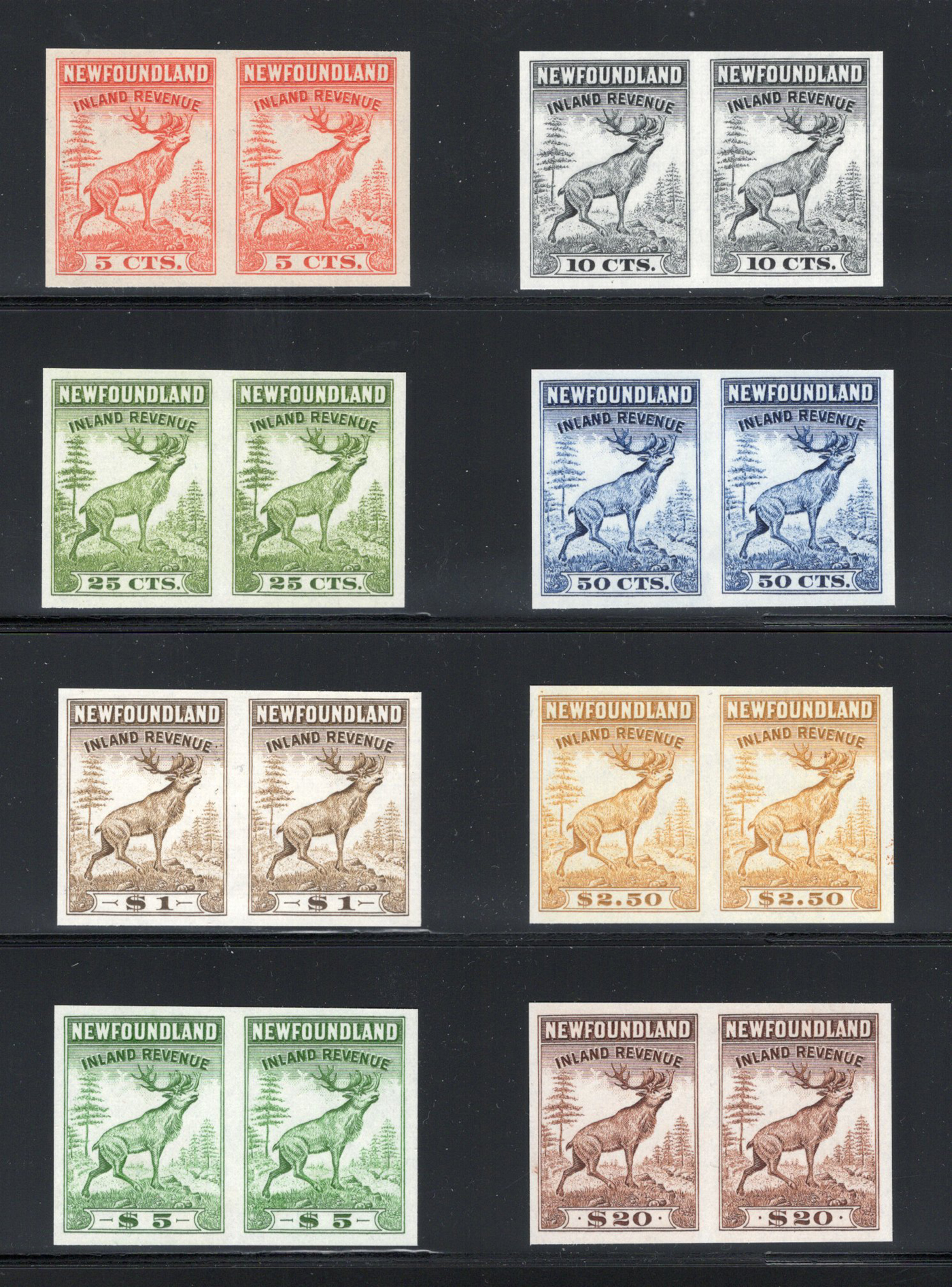 628 nh NFR46A-NFR53A image1966 5c to $20 Caribou Inland Revenue Set, Imperforate, each of the 8 values is in a mint horizontal imperforate pair, with original white gum which is never hinged. Very fine, fresh and rare, with only one sheet of 50 printed for each value.