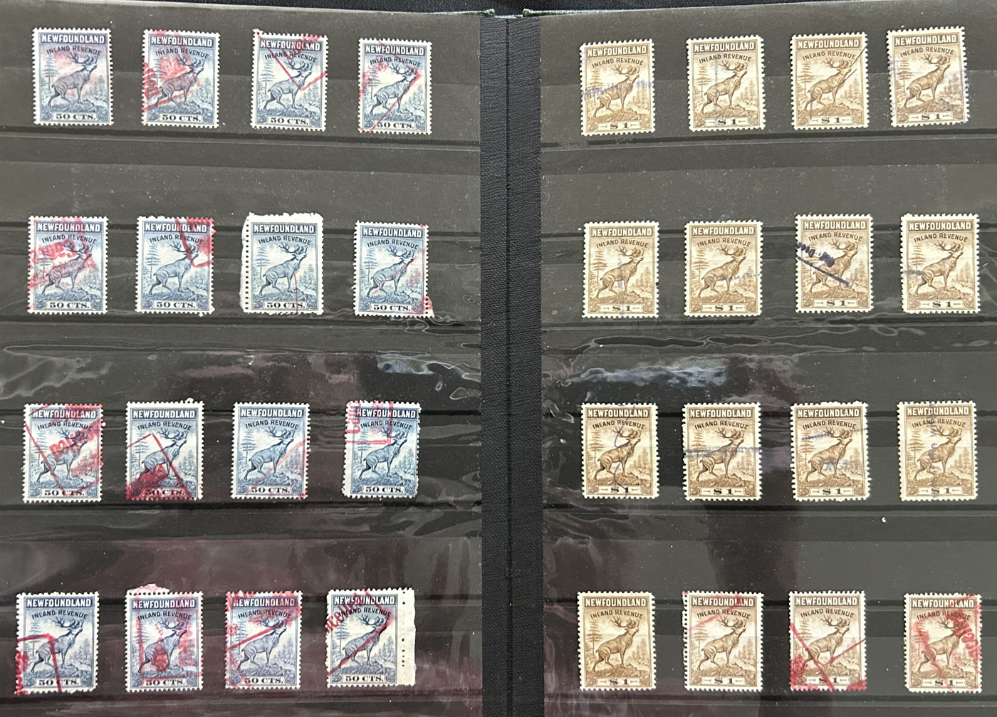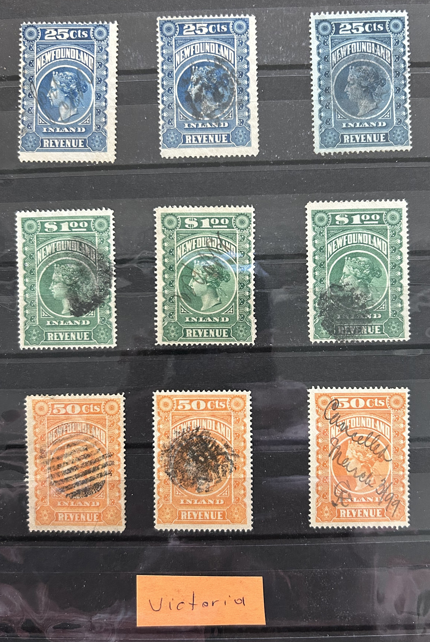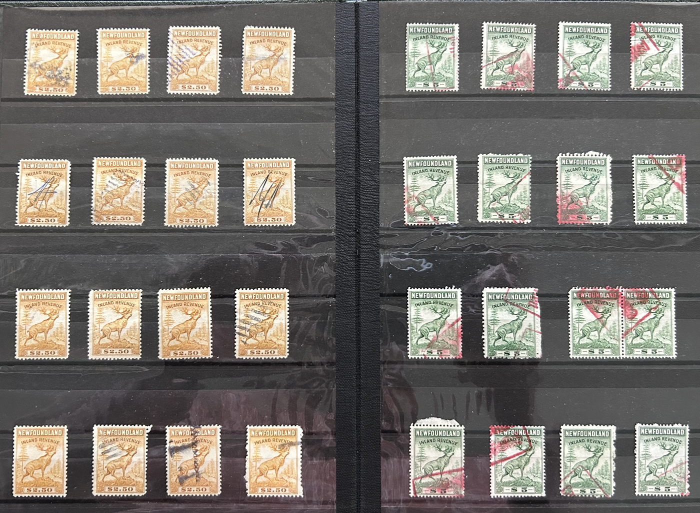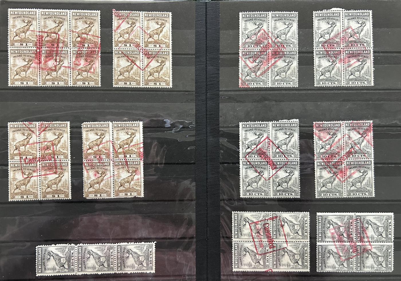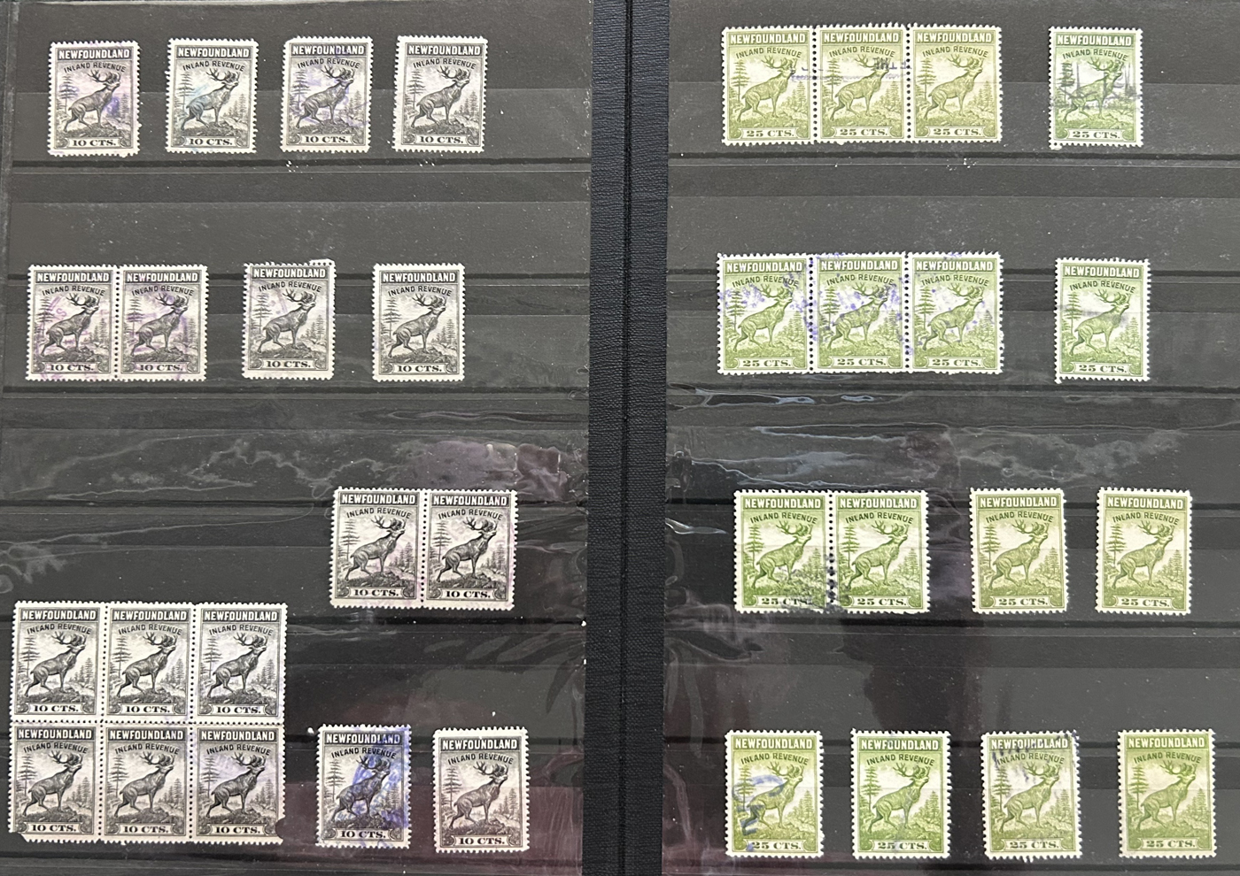630 O   imageCollection of Used Newfoundland Revenue Stamps, all neatly displayed in a small stockbook, with many different issues / denominations / cancels types, includes blocks of four and pairs, etc. with duplication of some. Overall fine to very fine, a rarely offered group. All pages shown online. (Scan 1) (Scan 2) (Scan 3) (Scan 4) (Scan 5) (Scan 6) (Scan 7) (Scan 8) (Scan 9) (Scan 10) (All Scans)