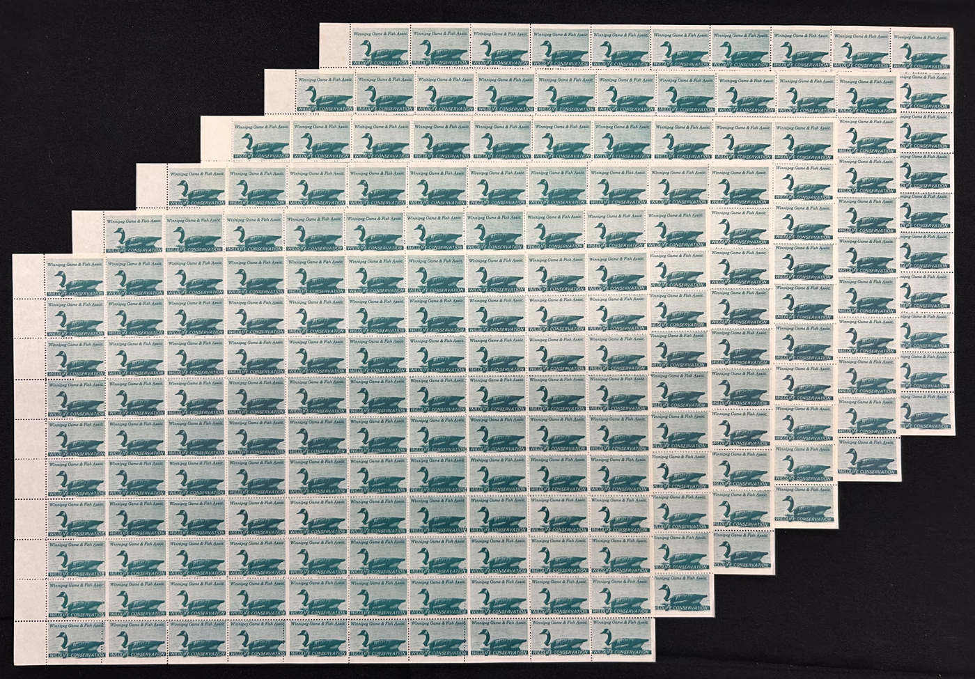 624 ng MW1, MW1c image1967 Turquoise City of Winnipeg Wildlife Conservation Stamp, a bulk lot of 6 full sheets of 100, each showing the mixed perforation varieties in rows 3, 6 and 9, without gum (as issued). Catalogued as 30 vertical strips of 3 with different perfs (MW1c) plus 10 regular stamps (x6 sheets). Very fine.