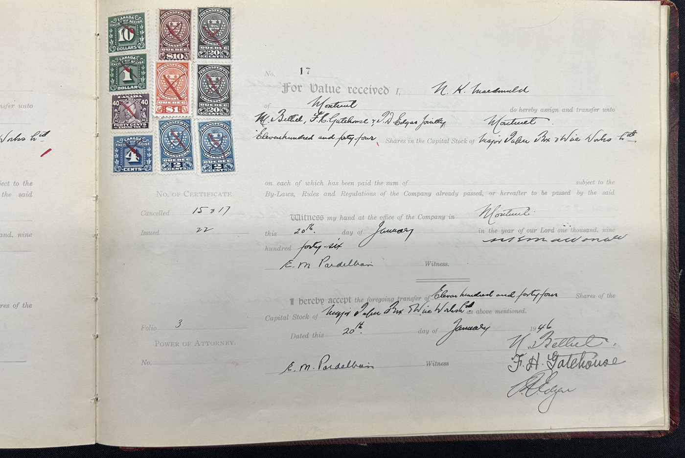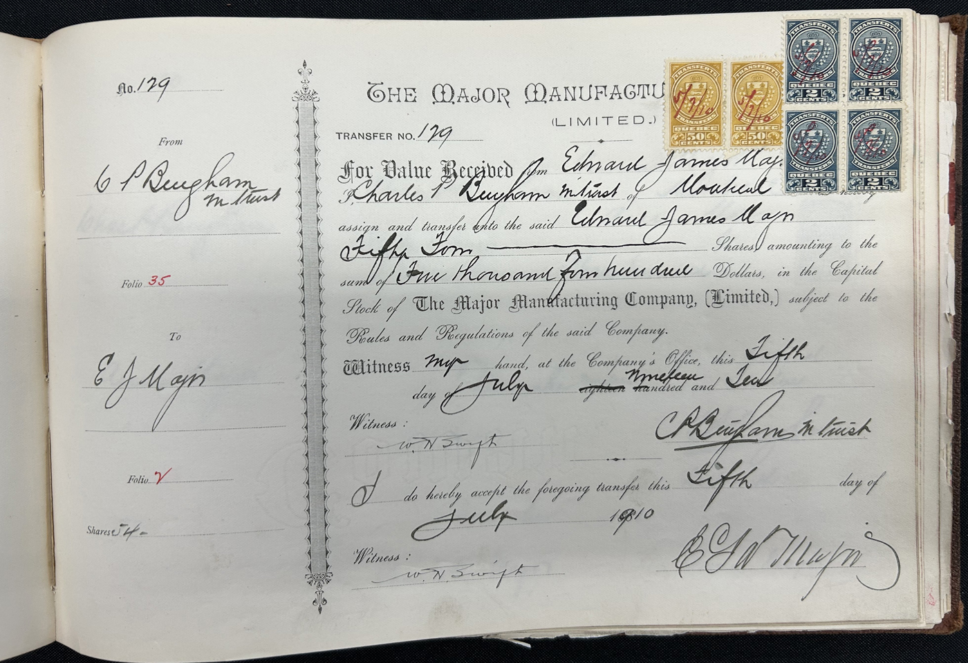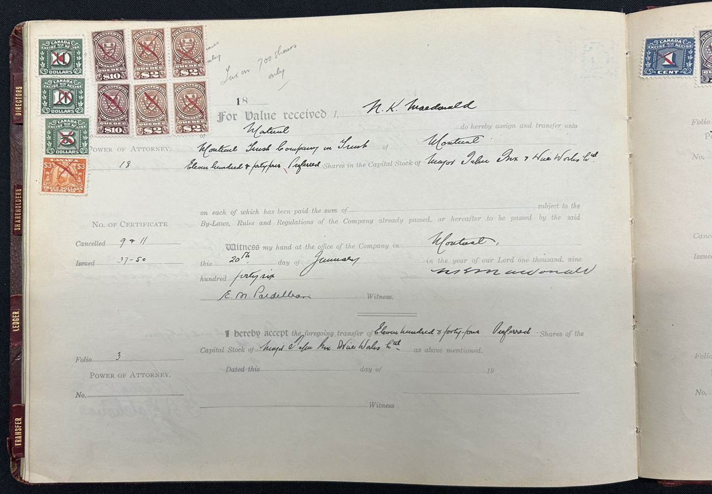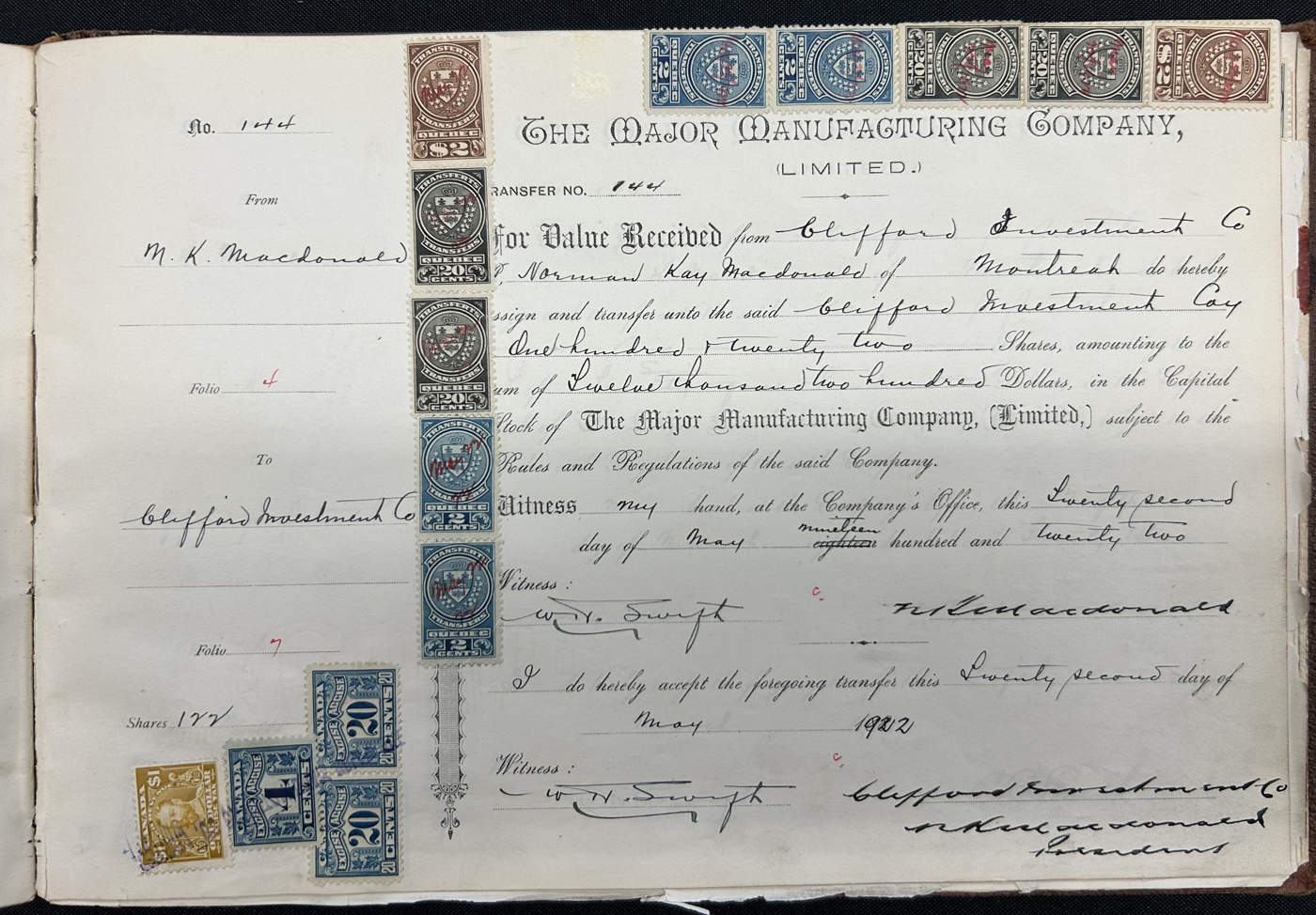 631 O QST6/QST19 imageTwo Old Québec Stock Transfer Ledgers, 1886-1926, from the Major Manufacturing Company in Montréal, both books listing various stock holders and their stock transfers, many pages (as early as 1910) franked with various Québec Stock Transfer stamps, some also with Federal Excise stamps. We counted over 150 stamps in all, including two $2 values from the first issue, rest are from the second issue 1c (x9), 2c (x50), 3c (x8), 10c (x12), 20c (x25), 50c (x17), $1 (x9), $2 (x21) and $10 (x4). An interesting and rare offering. (Scan 1) (Scan 2) (Scan 3) (Scan 4) (Scan 5) (Scan 6) (Scan 7) (Scan 8) (All Scans)