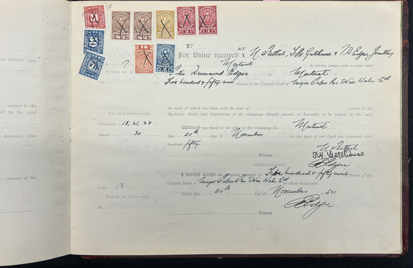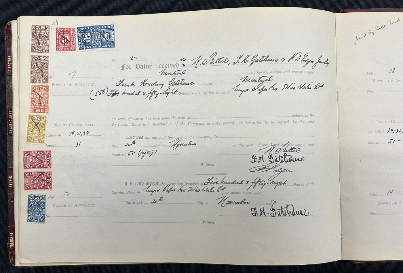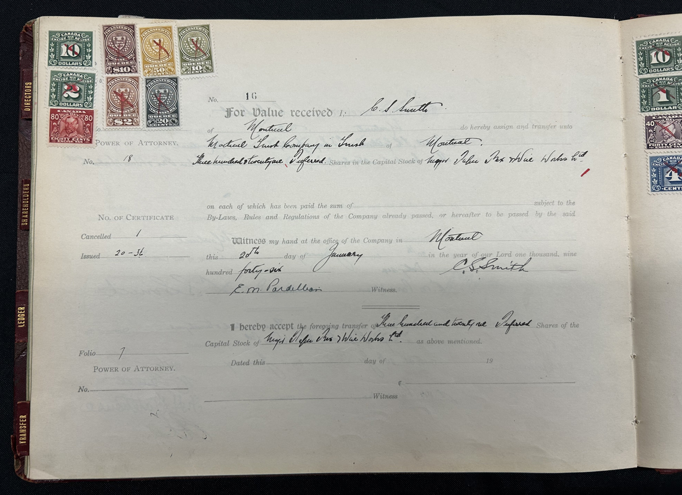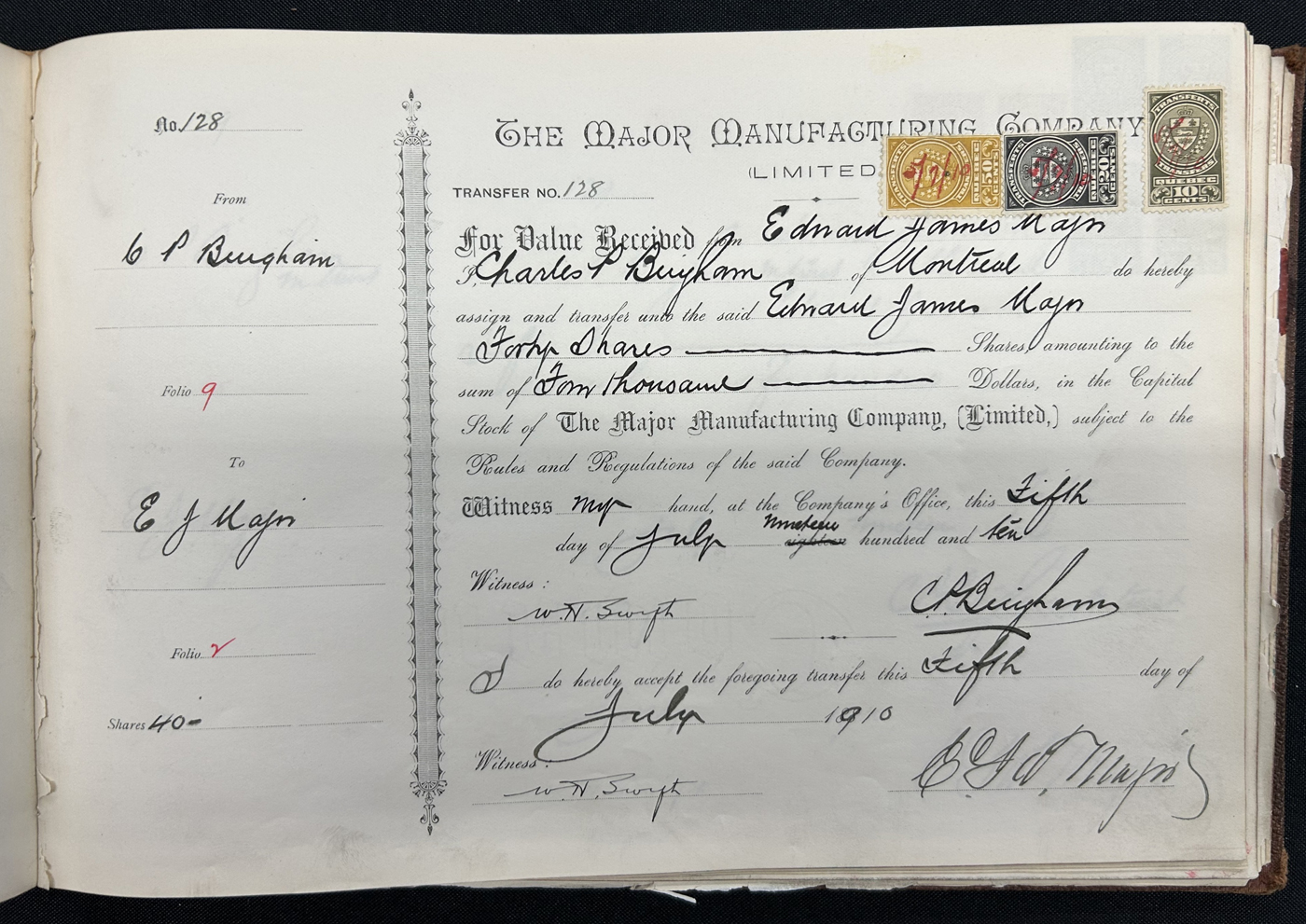 631 O QST6/QST19 imageTwo Old Québec Stock Transfer Ledgers, 1886-1926, from the Major Manufacturing Company in Montréal, both books listing various stock holders and their stock transfers, many pages (as early as 1910) franked with various Québec Stock Transfer stamps, some also with Federal Excise stamps. We counted over 150 stamps in all, including two $2 values from the first issue, rest are from the second issue 1c (x9), 2c (x50), 3c (x8), 10c (x12), 20c (x25), 50c (x17), $1 (x9), $2 (x21) and $10 (x4). An interesting and rare offering. (Scan 1) (Scan 2) (Scan 3) (Scan 4) (Scan 5) (Scan 6) (Scan 7) (Scan 8) (All Scans)