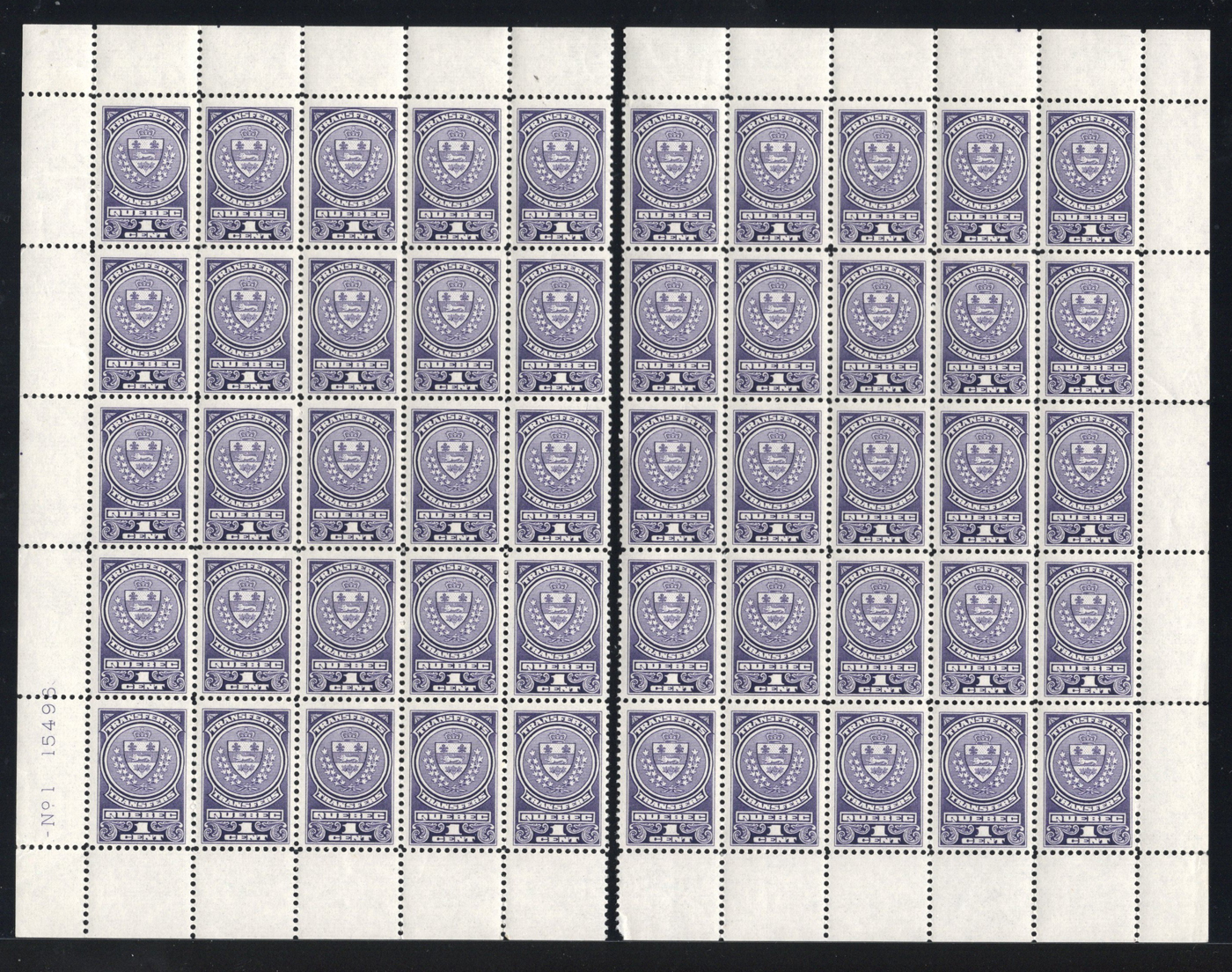 632 nh QST9 image1913 1c Violet Québec Stock Transfer Stamp, a mint never hinged full pane of 100 (separated in two), with plate inscription at lower left, some separation on the right side, very fine and scarce in this format.