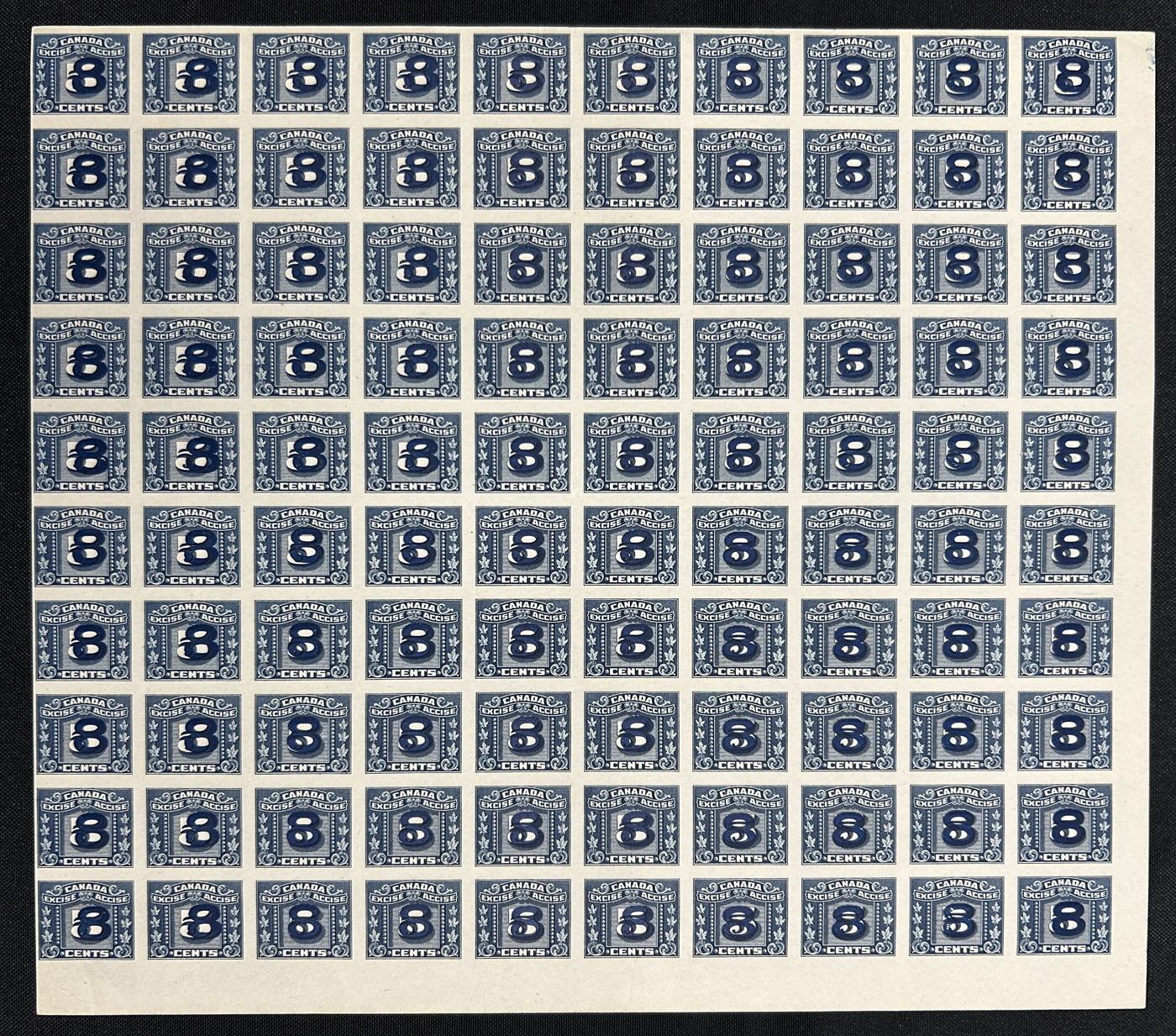 621 ng FX137a image8 on 5c Blue Excise Stamp, Imperforate, an unused (no gum, as issued) sheet of 100, with sheet margin on two sides, fresh and very fine. A rare complete sheet.