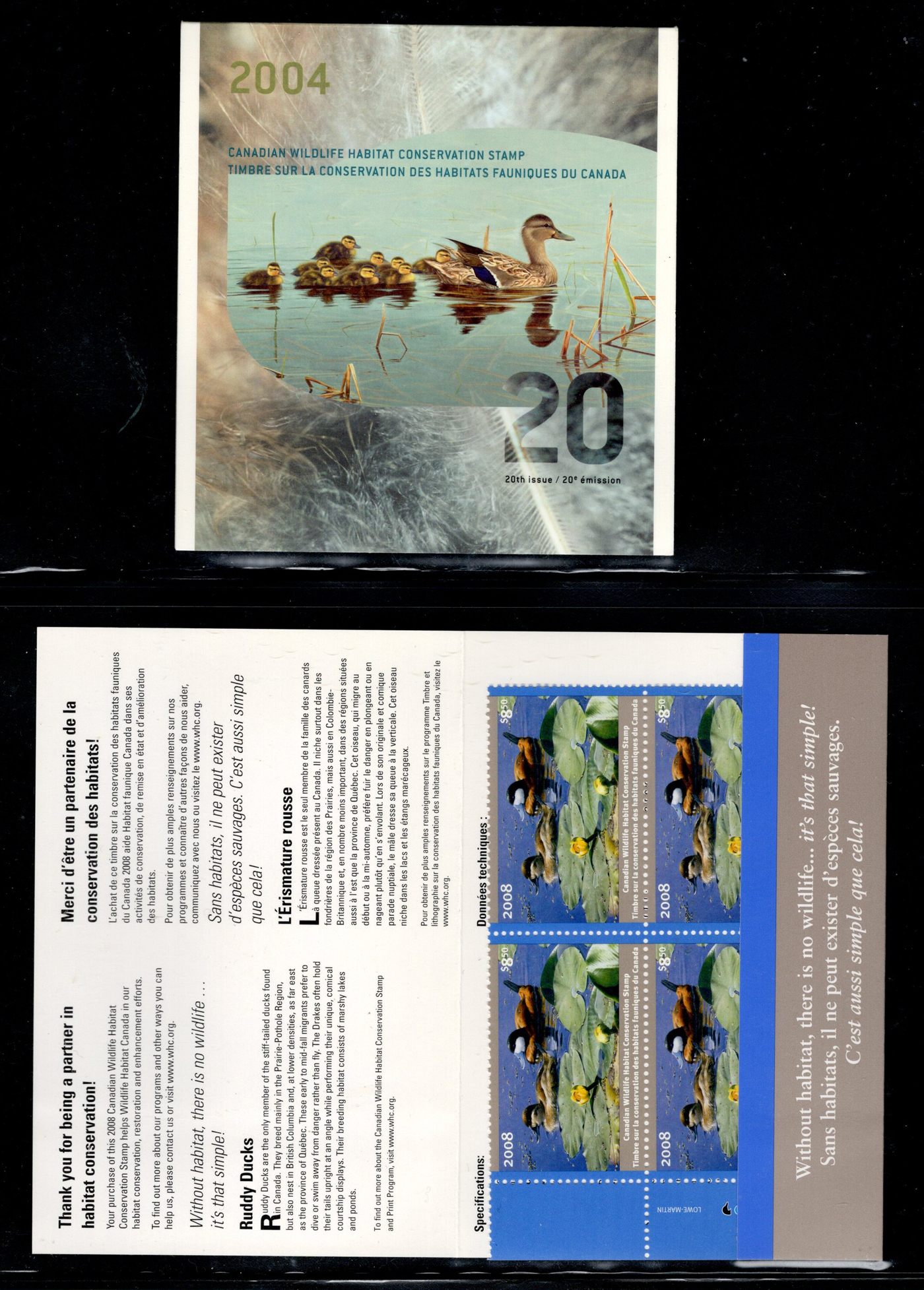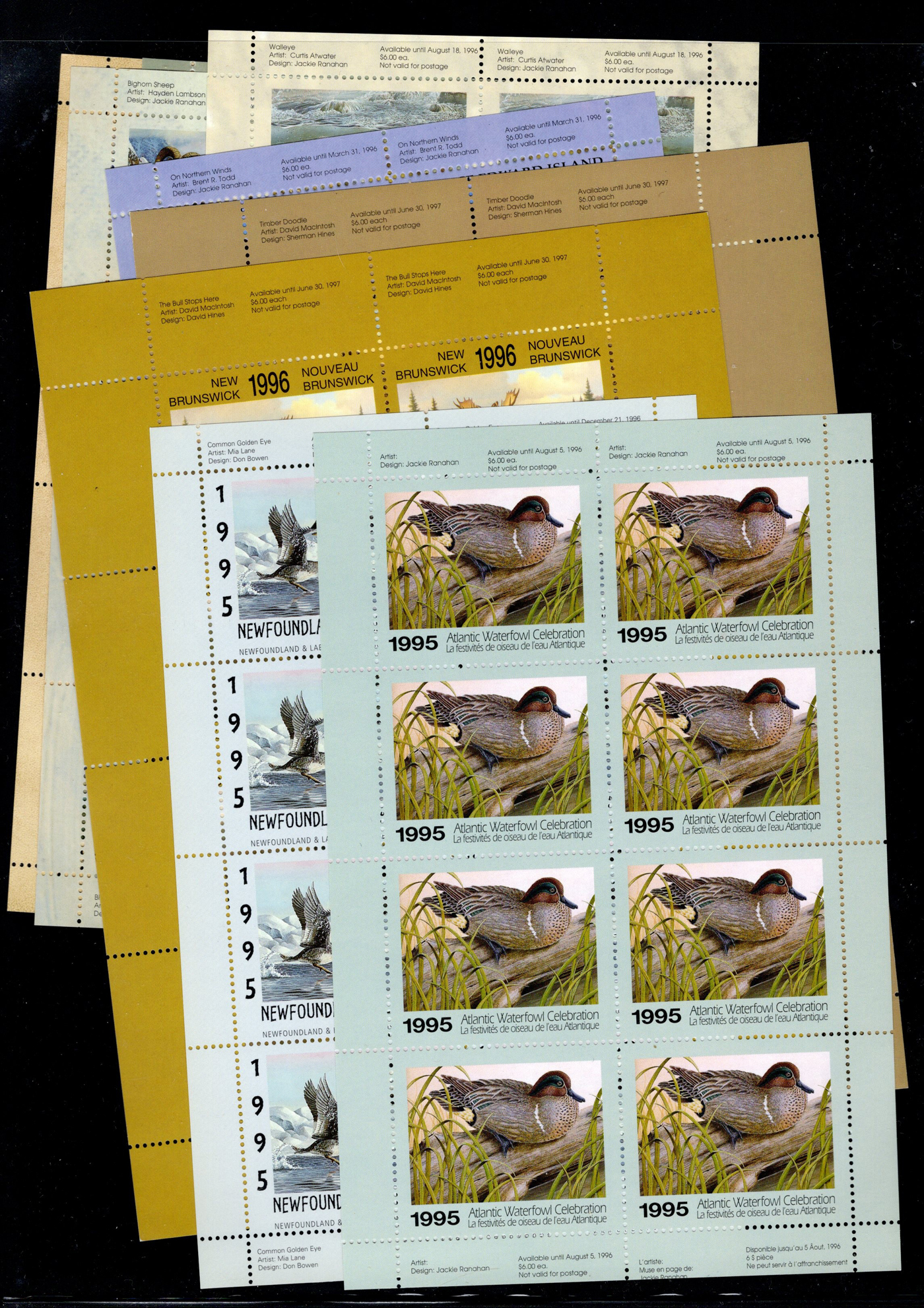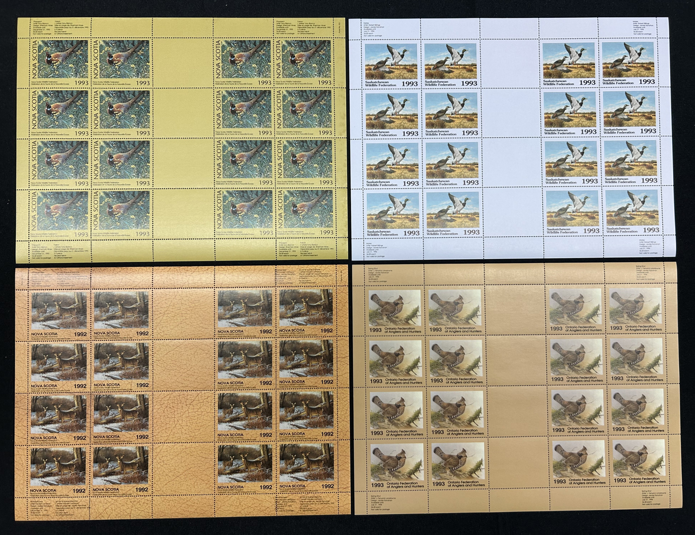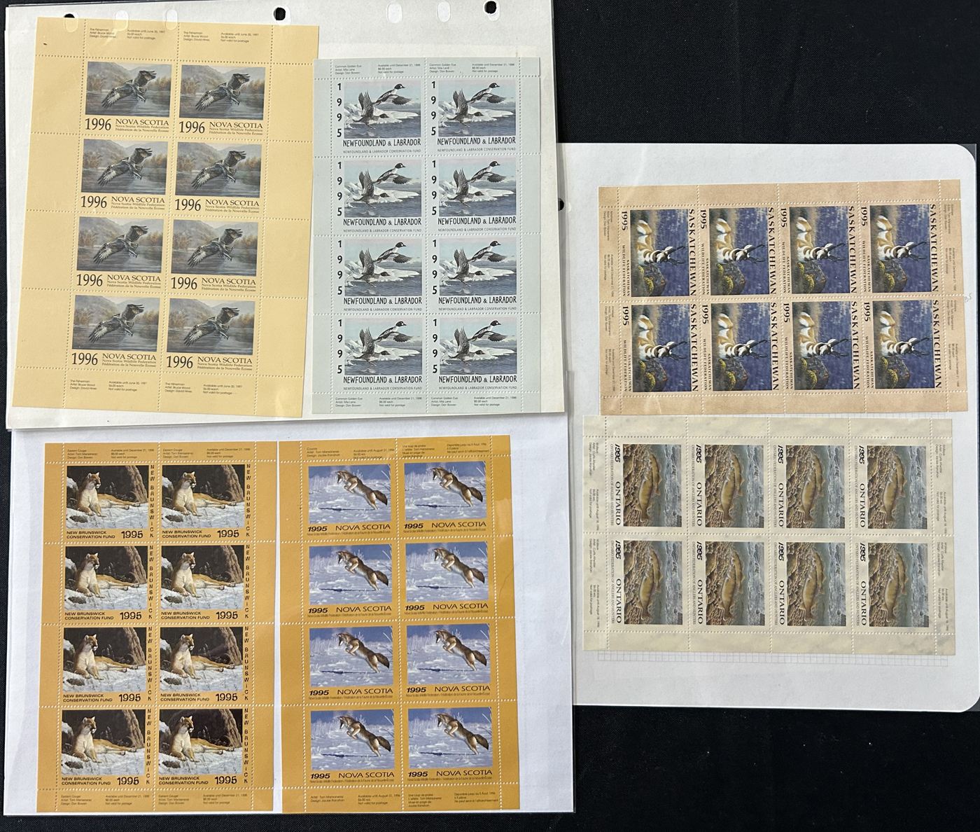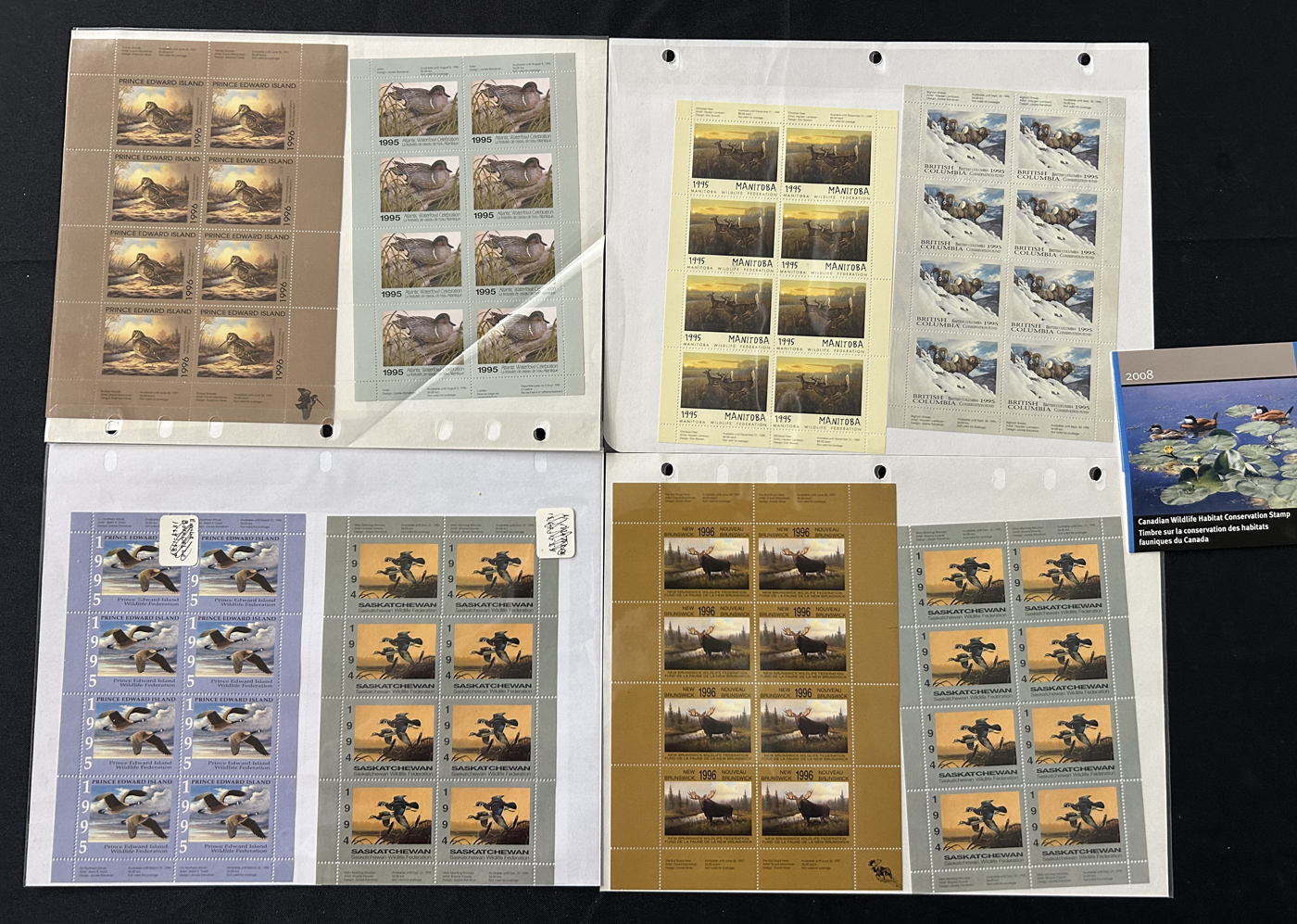 633 nh   imageGroup of Federal and Provincial Wildlife Stamps, the Federal are represented by a complete run from 1985 to 2008 stamps in their booklets, plus one 2008 signed stamp, a block of four (2008) and sheet of 16 (2008). Up to here catalogues $1,070. Also includes a desirable group of 9 different Provincial sheets of 8 (1995-1996) which catalogue $1,335. All very fine. (Scan 1) (Scan 2) (Scan 3) (Scan 4) (Scan 5) (All Scans)