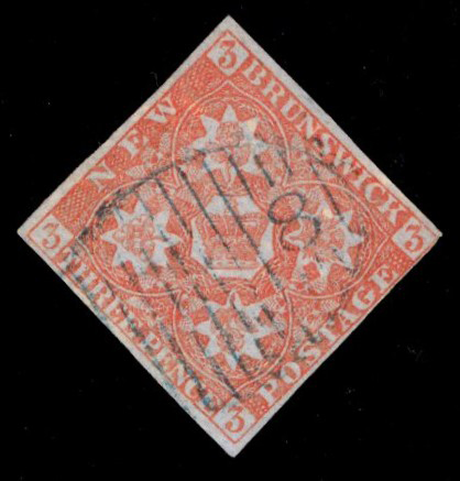 638 O 1 image1851 3d Red Heraldic Imperforate, used with very fine strike of the #8 in oval grid cancel (Chatham, in blue), margins are well clear to close in one corner, fine-very fine.