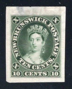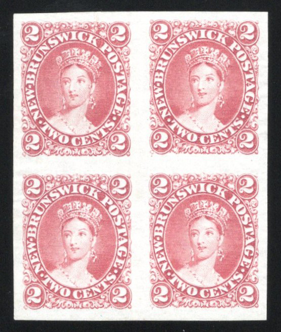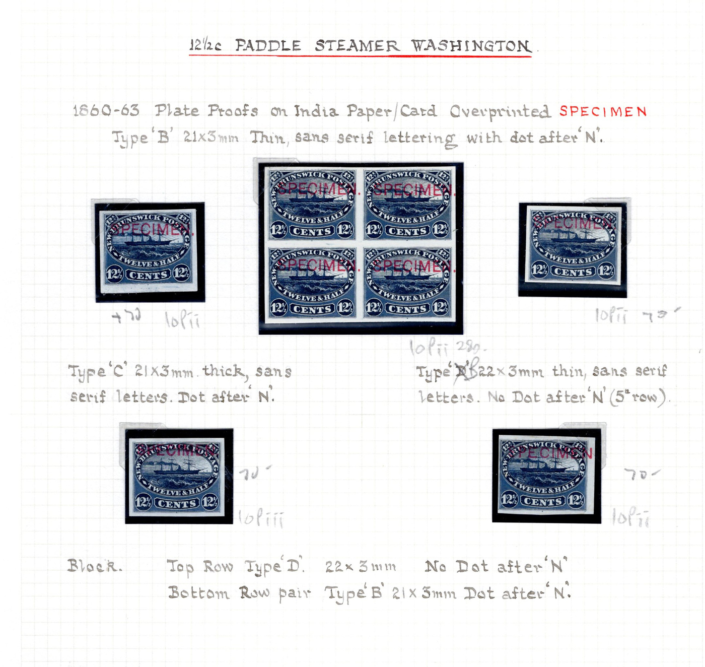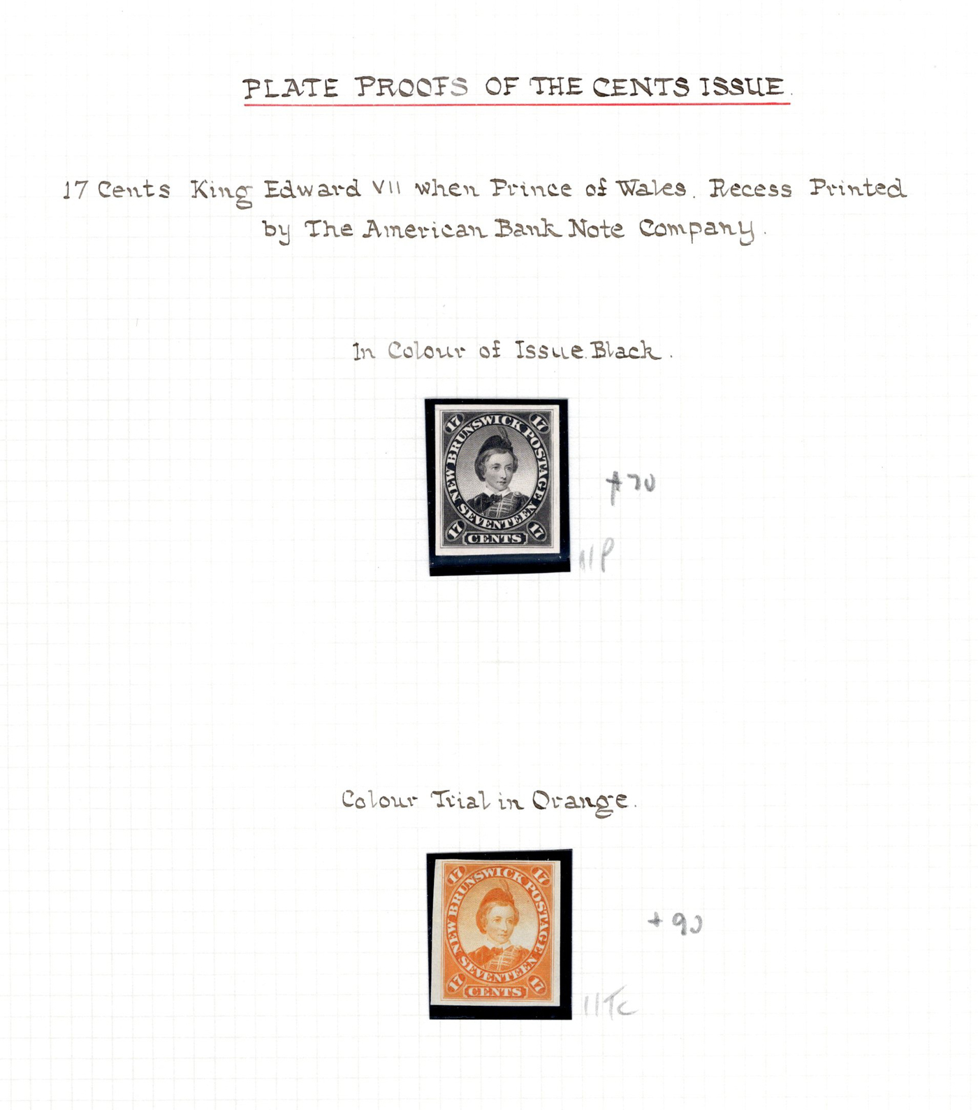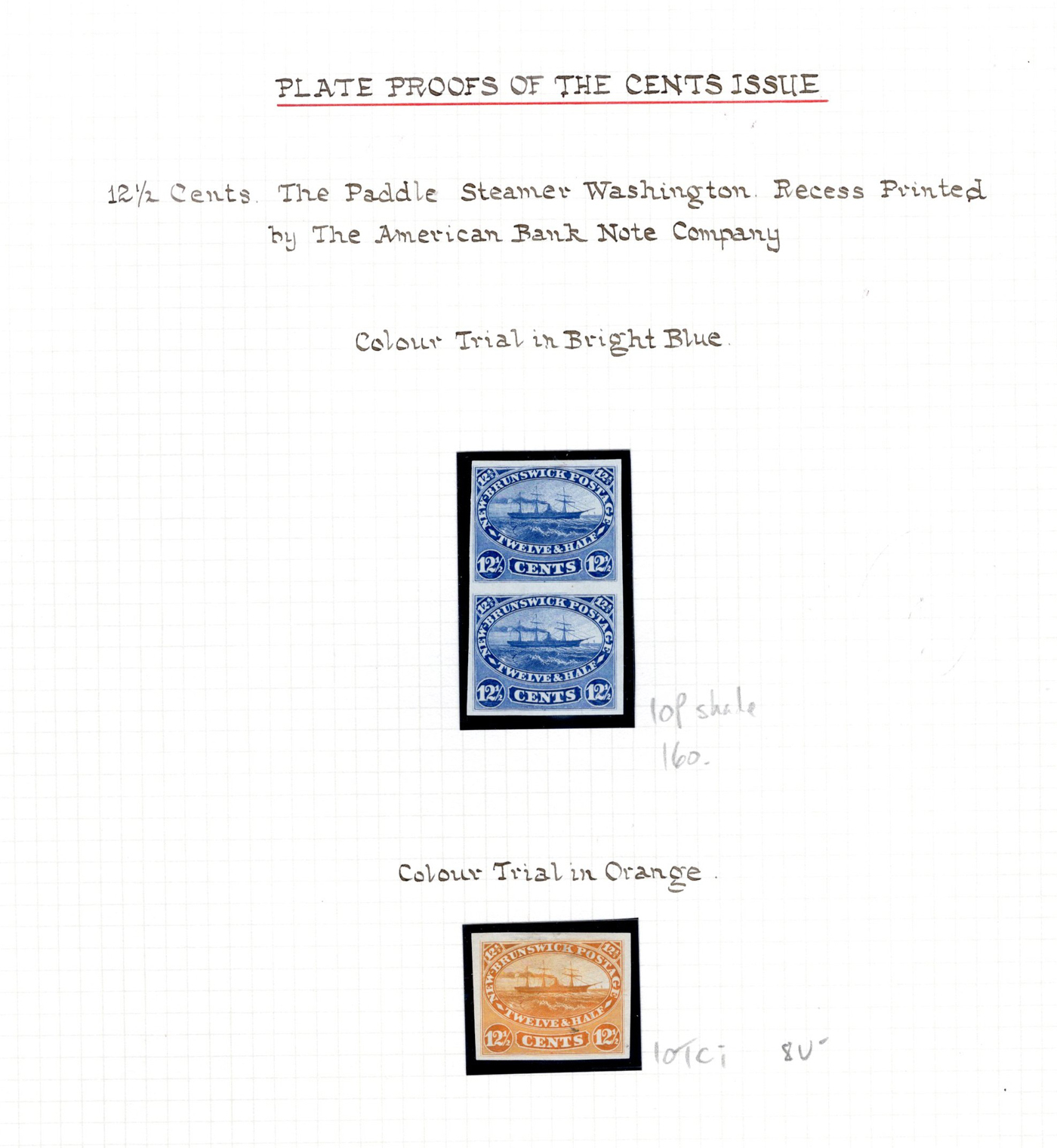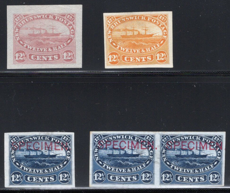 647 E/P 10P/11TC imageCollection of New Brunswick Plate Proofs, neatly written-up on three quadrille pages, with eleven 12½c proofs, in singles and blocks, with trial colours and with both types of SPECIMEN overprints. Also two of the 17c proofs, one in black and one in orange. Overall very fine. (Scan 1) (Scan 2) (Scan 3) (All Scans)