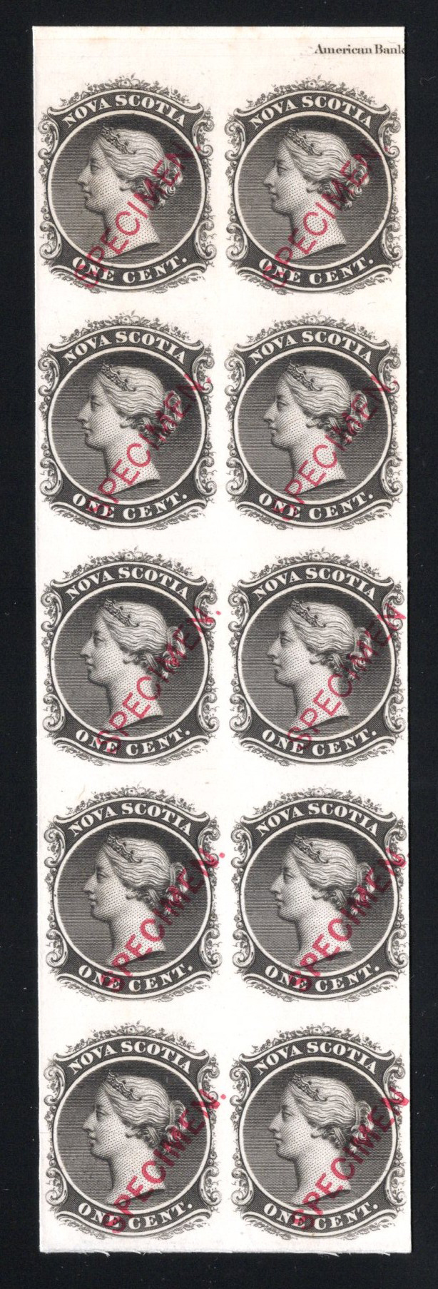 654 E/P 8Pii, 8Piii image8½c Queen Victoria Plate Proof in Black, a vertical block of 10 (2x5) on card-mounted India paper, from positions 7/48 showing diagonal SPECIMEN overprints in red, type B (x6) and type C (x4), also showing part of the imprint at top, very fine. A nice positional block.