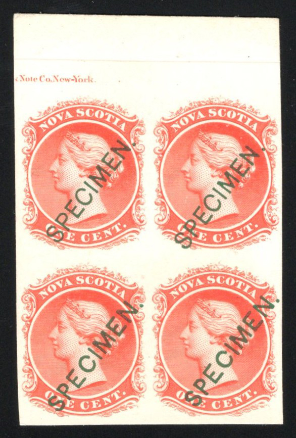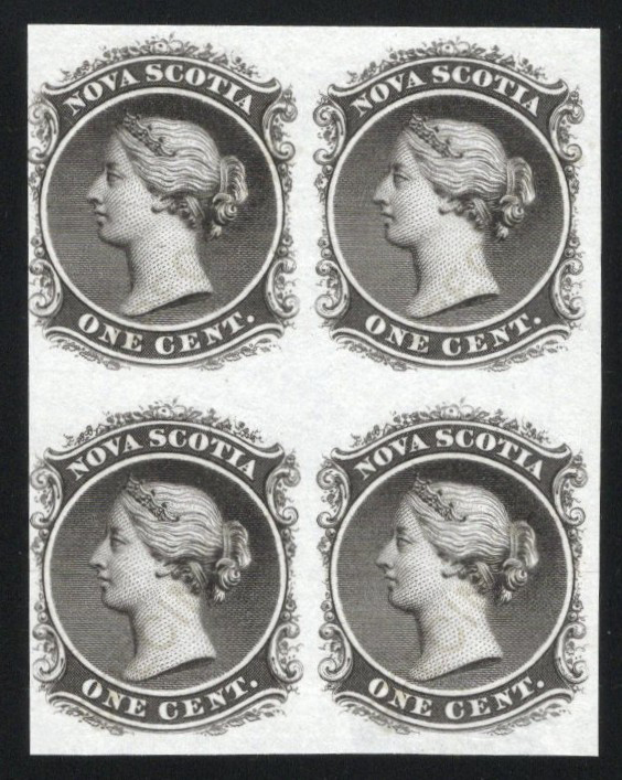 656 E/P 8Pv image1c Queen Victoria Plate Proof in Black, with SPECIMEN Overprint in Gold, a block of four printed on India paper, with a faded overprint, fine-very fine and scarce. Unitrade footnote says "Examples are known with SPECIMEN almost faded out ... same value".