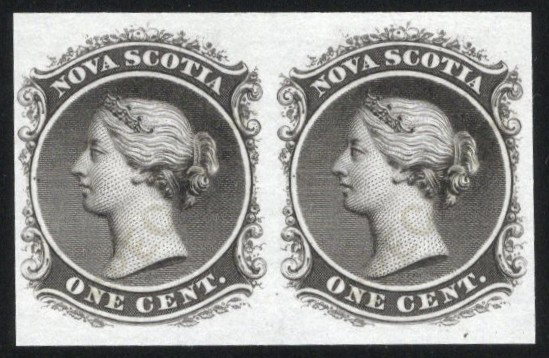 657 E/P 8Pv image1c Queen Victoria Plate Proof in Black, with SPECIMEN Overprint in Gold, a horizontal pair printed on India paper, with a faded overprint. The left stamp shows a spot where the paper is naturally thinner, which is not unusual for this fragile paper, still very fine and scarce. Unitrade footnote says "Examples are known with SPECIMEN almost faded out ... same value".