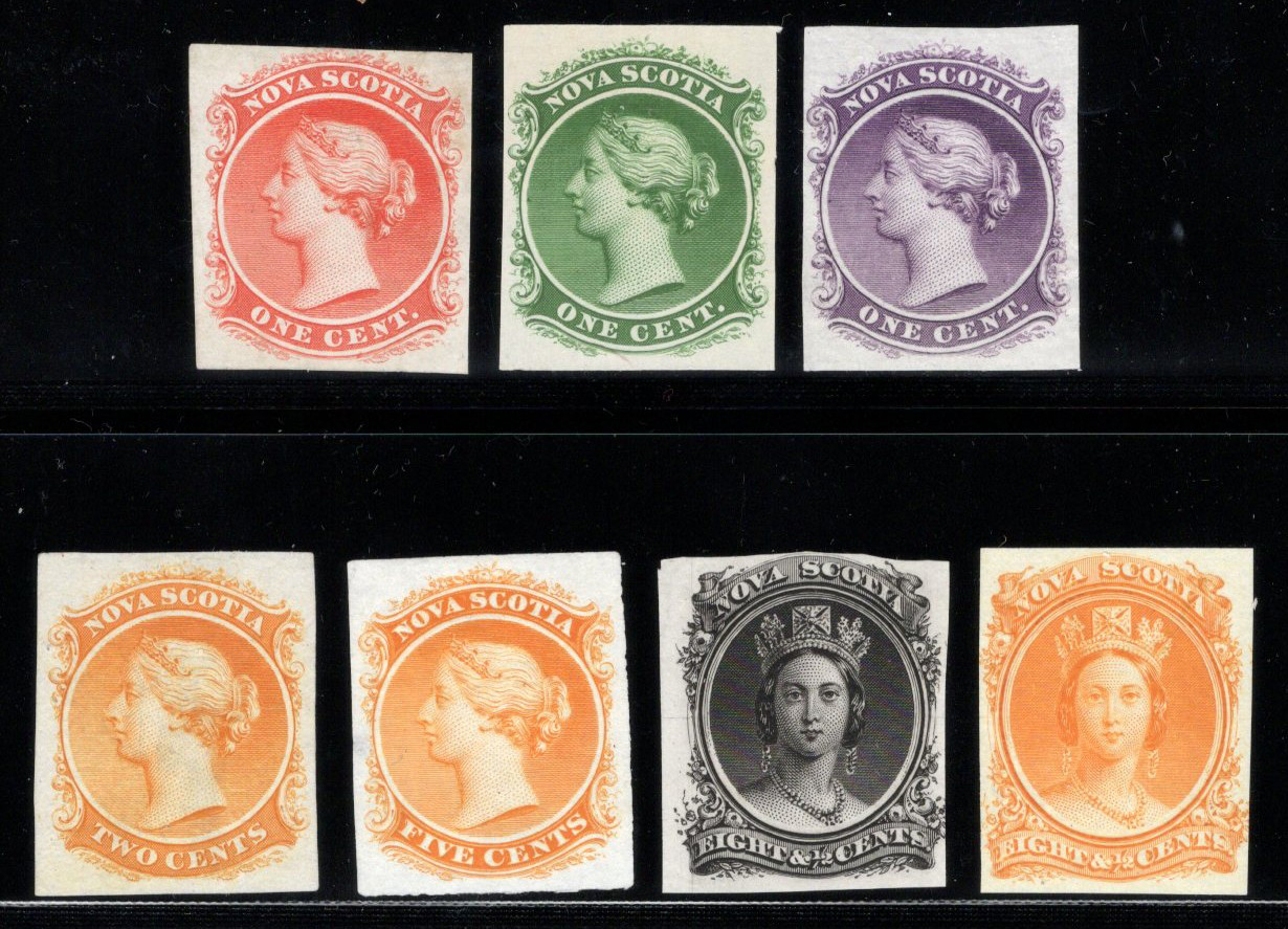 650 E/P 8TC/11TCvii imageGroup of 1c to 8½c Queen Victoria Trial Colour Plate Proofs, all on India paper, includes #s 8TC, 8TCv, 8TCx, 9TCi, 10TCvii, 11TC and 11TCvii, very fine.