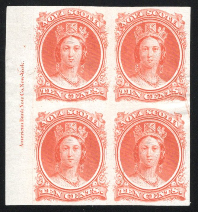660 E/P 12P image10c Queen Victoria Plate Proof in Vermilion, a left sheet margin plate inscription block of four, printed on India paper, with slight wrinkles, still very fine.