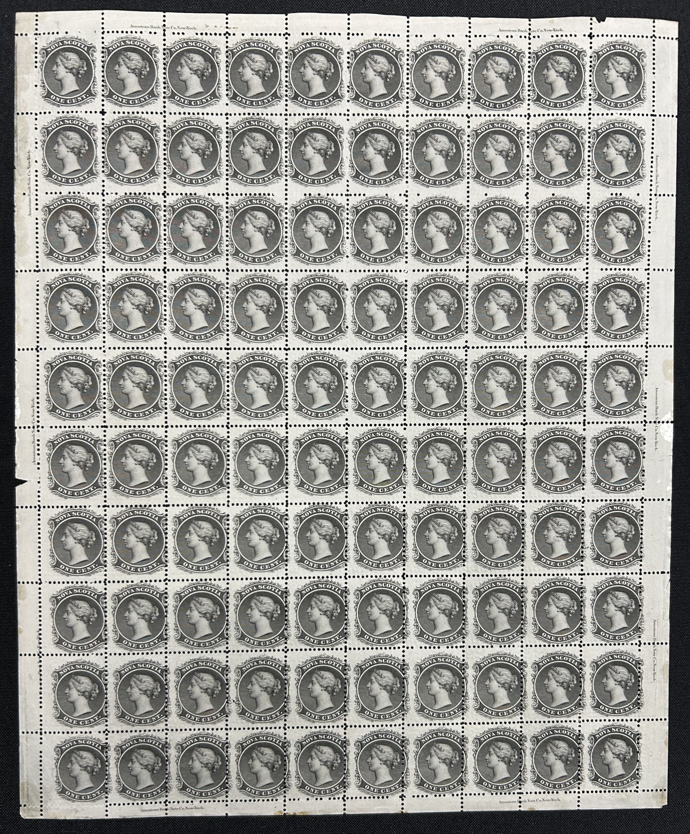 659 nh 8 image1860 1c Black Queen Victoria, a full sheet of 100, with 10 plate inscriptions, never hinged, with natural gum yellowing where it was applied thicker. A better than usually seen sheet of this issue, with no evidence of having been folded, fine to very good. Scott catalogue value is for 100 singles only, and included no premium for plate inscriptions.
