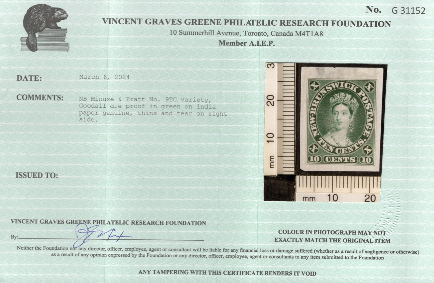 644 E/P 9TC image10c Queen Victoria Goodall Die Proof in Deep Green, on India paper, with large margins, the proof has thins and a small tear, else a scarce trial colour proof not listed in Unitrade. Accompanied by a 2024 Greene Foundation certificate. (Scan 1) (Scan 2) (All Scans)
