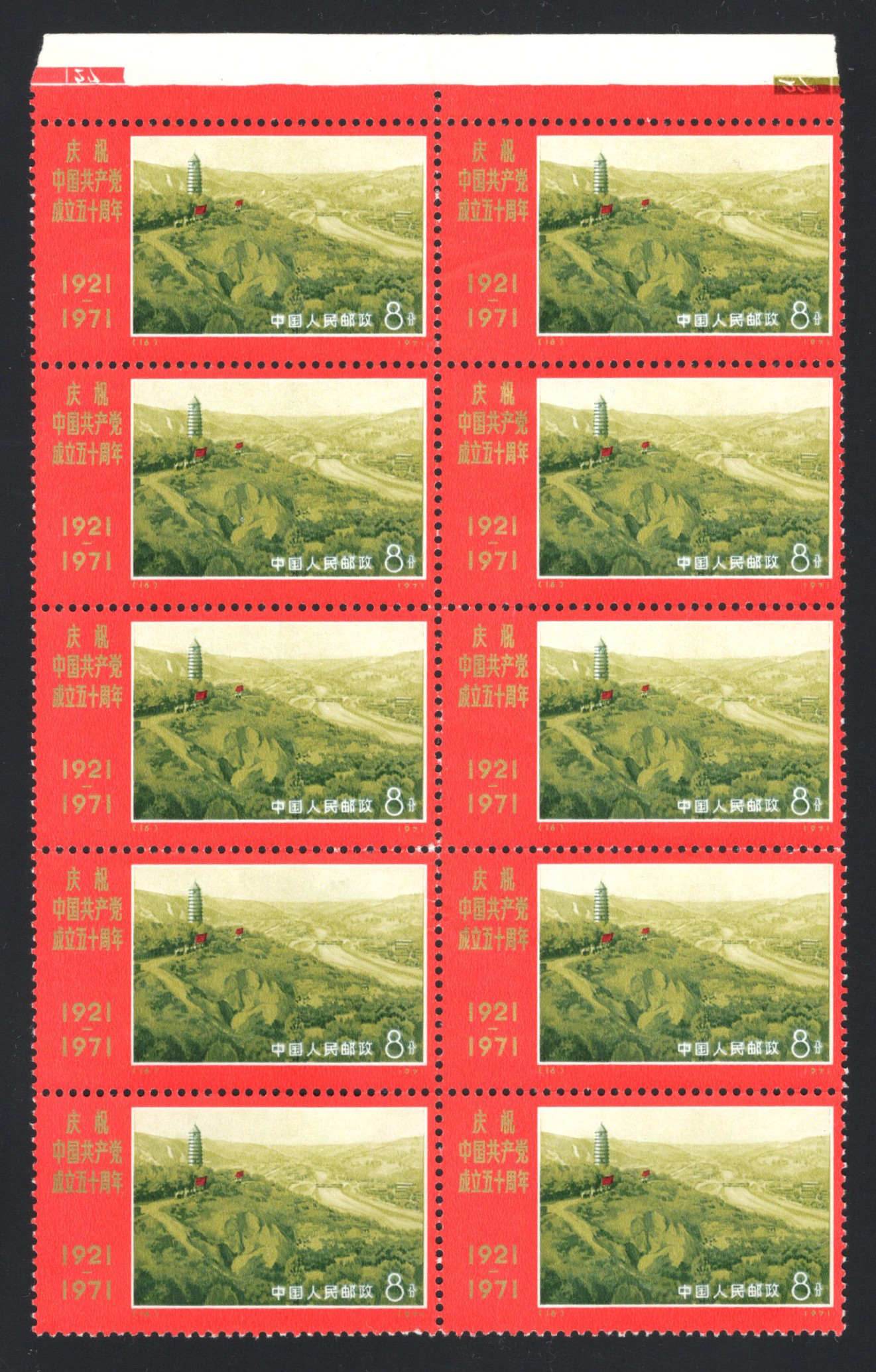 738 nh 1071 image1971 8f Pagoda Hill, Yenan, a mint never hinged upper sheet margin block of 10, the top two stamps have light bends, the rest are fresh and very fine. A scarce multiple.