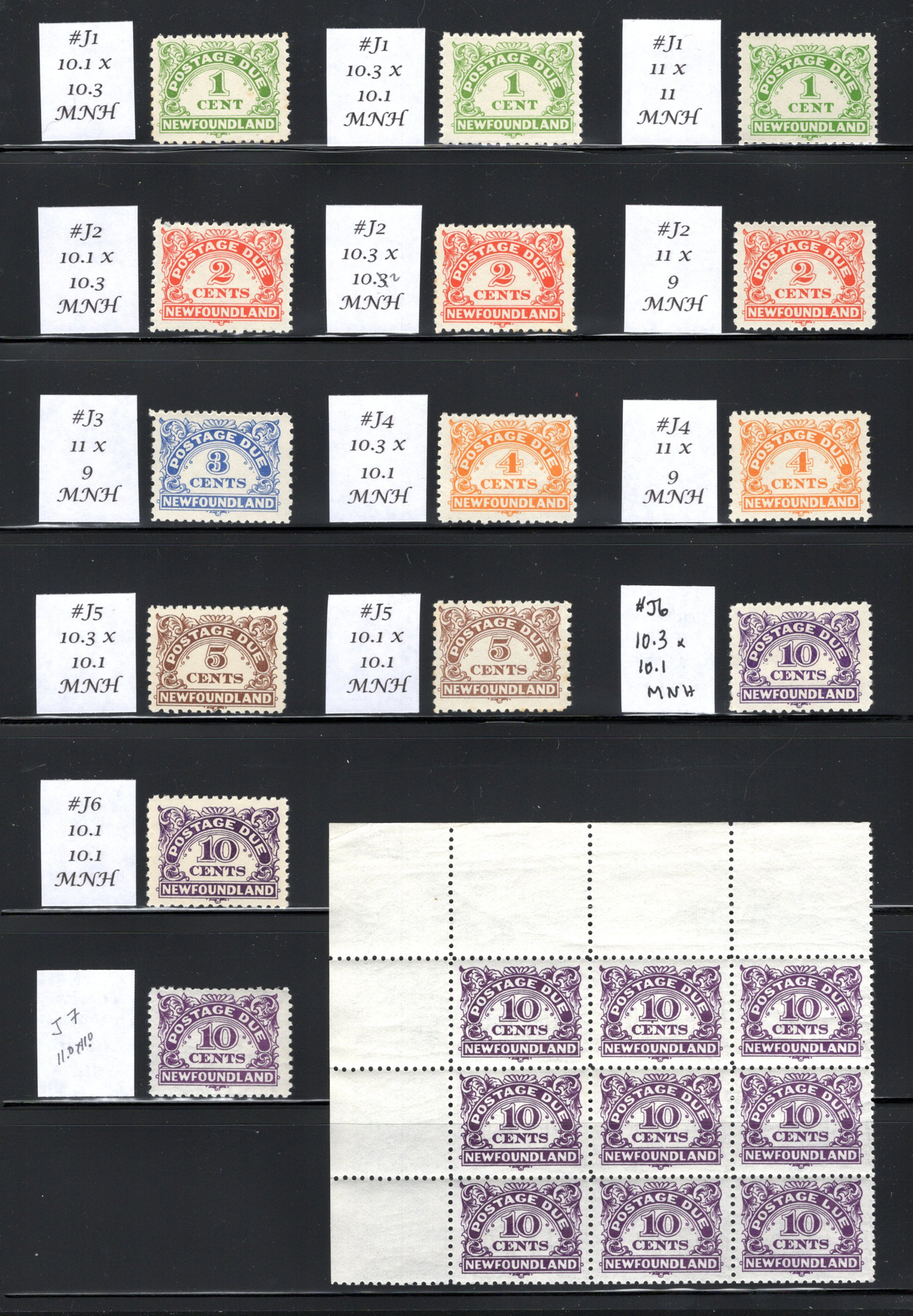 725 nh J1-J7 image1939-1949 1c to 10c Postage Due Study Group, consisting of the 1c (3 different perforations), 2c (3 different perforations), 3c, 4c (2 different perforations), 5c (2 different perforations) and 10c (3 different perforations) for a total of 14 different mint never hinged stamps Also includes an upper left corner block of 9 with the "POSTAGE LUE" variety on position 23 (lower right stamp), "broken S of CENTS" on position 1 (upper left stamp, as listed in Walsh) and "balloon under 1 of 10" on position 2 (upper middle stamp, as listed in Walsh). A very fine and useful lot for the specialist.