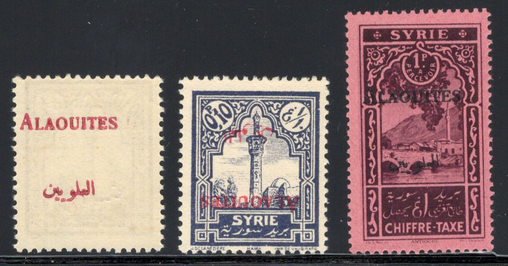 728 nh   imageThree Mint Never Hinged Alaouites Overprint Varieties, with Scott #s 25b (overprinted on both sides), 25f (inverted overprint) and J7a (overprint in black), fresh and fine to very fine. Yvert & Telllier Colonies catalogue #s 22a, 22f and 7a, €305.
