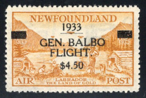 723 og C18 image1933 $4.50 on 75c Bistre Balbo Flight Surcharge, Perforated 14.3, mint very lightly hinged and well centered, fresh and very fine.