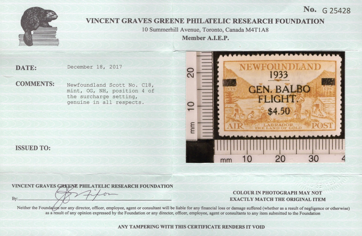 722 nh C18 image1933 $4.50 on 75c Bistre Balbo Flight Surcharge, Perforated 14.3, mint never hinged and well centered, fresh and very fine. Accompanied by a 2017 Greene Foundation certificate placing the surcharge at position 4 of the setting. (Scan 1) (Scan 2) (All Scans)