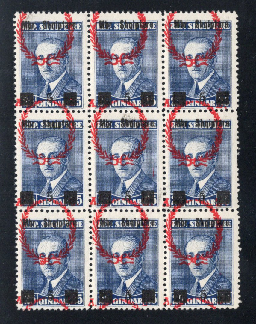 729 nh 209var image1928 5q on 25q Dark Blue Surcharge, with Dramatically Misplaced Red Overprint, a mint never hinged block of 9, with the black surcharge correct, but the red overprint misplaced on all stamps, very fine.