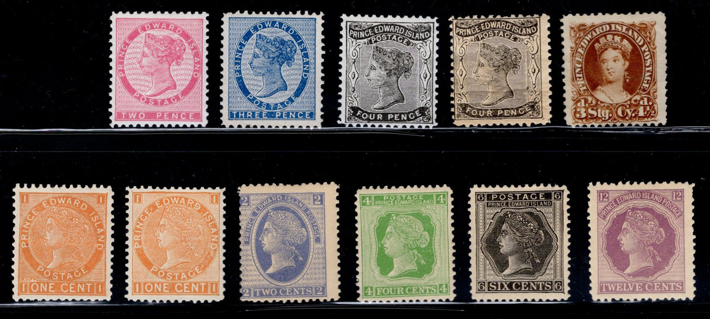 727 ng/nh 5-16 image1862-1872 Prince Edward Island Runs, with Scott #s 5-10 and 11-16, all mint never hinged except for #10 which has no gum (and catalogued as such). There are also two extra stamps, 9a (with browned and cracked gum) and 11. Several are well centered, overall fine to very fine.