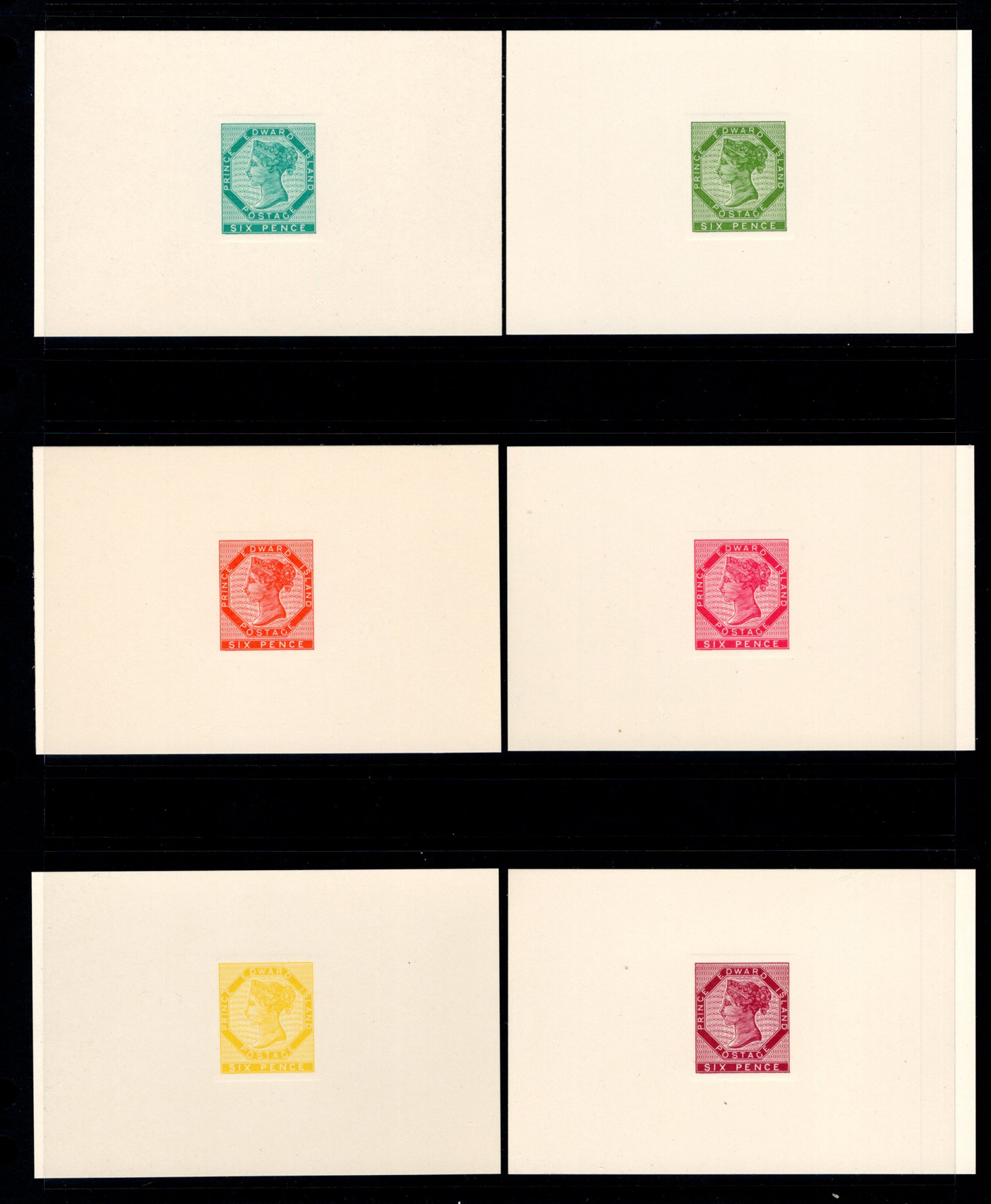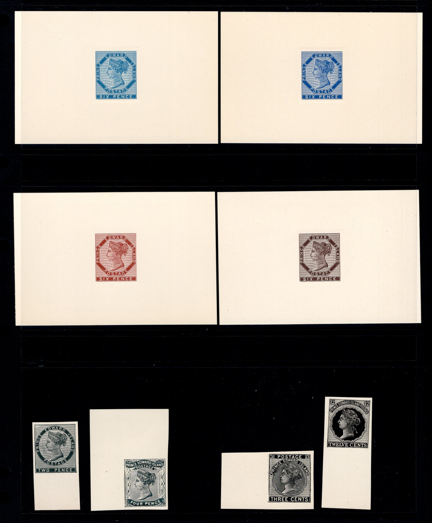 726 E/P   imageGroup of PEI Plate Proofs and Reprints, with a complete set of post-contemporary reprinted large die proofs of the 6d, in 10 different colours. Also four plate proofs of the 2d, 4d, 3c and 12c values, each on card in black, as produced by J. A. Tilleard and trimmed from the January 1893 issue of the London Philatelist. (Scan 1) (Scan 2) (All Scans)