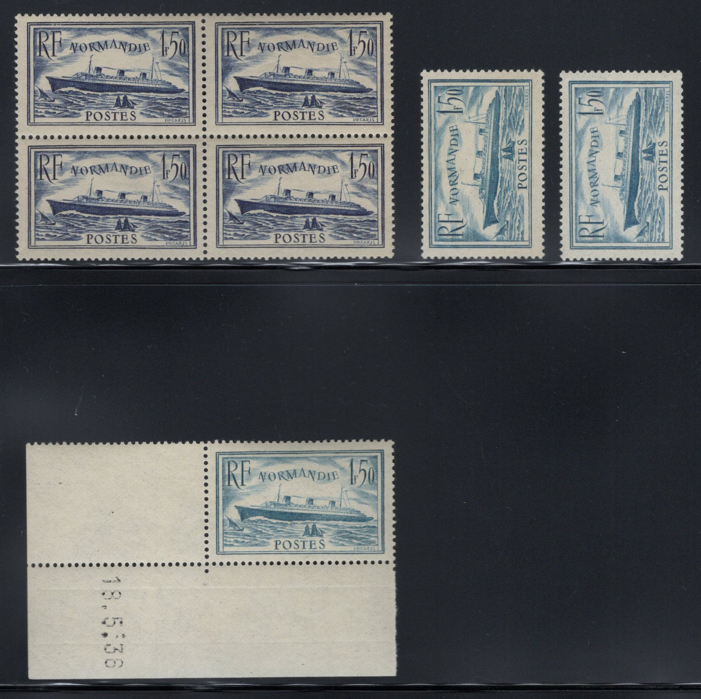 750 og/nh 300, 300a image1935 1fr50 S.S. Normandie Group, with a mint never hinged block of four in dark blue, plus three singles in pale blue (two are never hinged, one is a dated corner), overall very fine.