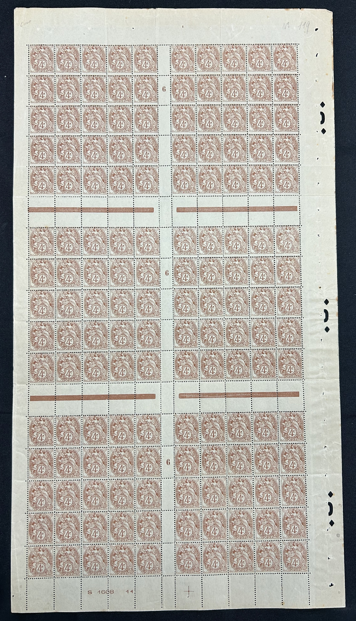 749 nh 112 image1906 4c Yellow Brown Blanc Issue, a mint never hinged complete sheet of 150. consisting of three panes of 50 stamps each, and each pane consisting of two panes of 50 separated by a gutter margin. There are three "Millésime 6" numbers on the sheet indicating a 1906 print year. The bottom of the sheet also includes a sheet number as well as a "croix de repère" (centering cross), and the right of the sheet includes three security punches. A fresh and overall very fine sheet, rarely offered as very few, if any others of these remain. Would look great framed. Yvert #110, €793 (including the millésimes).
