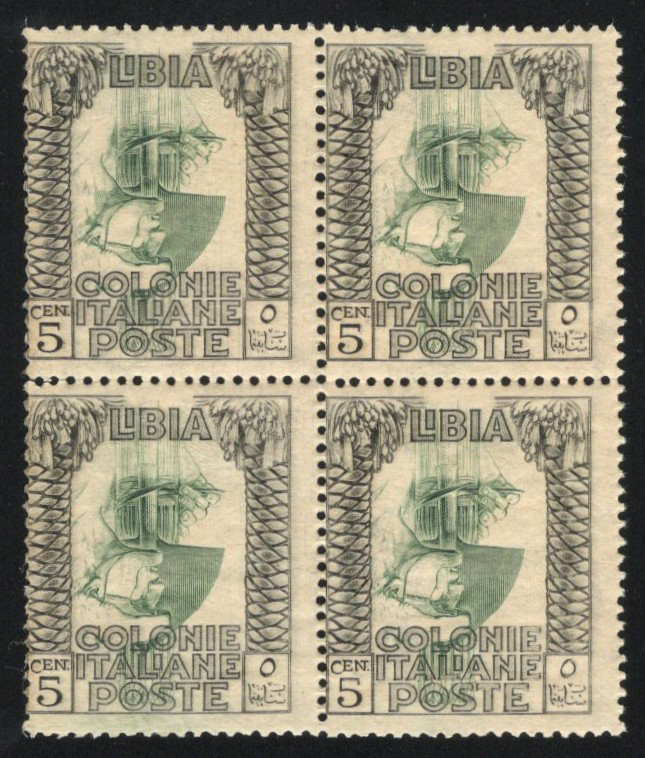 760 nh 22a image1921 5c Black with Green Inverted Centre, a mint never hinged block of four, with brownish (toned) gum and perf separation on one side, fine.
