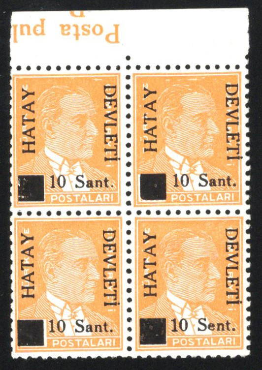755 nh 1, 1a image1939 10s on 20pa Deep Orange Surcharge with Variety, a mint never hinged upper margin block of four (with plate inscription in upper margin), the lower right stamp shows the "Sent." error (instead of "Sant"), very fine and seldom seen.
