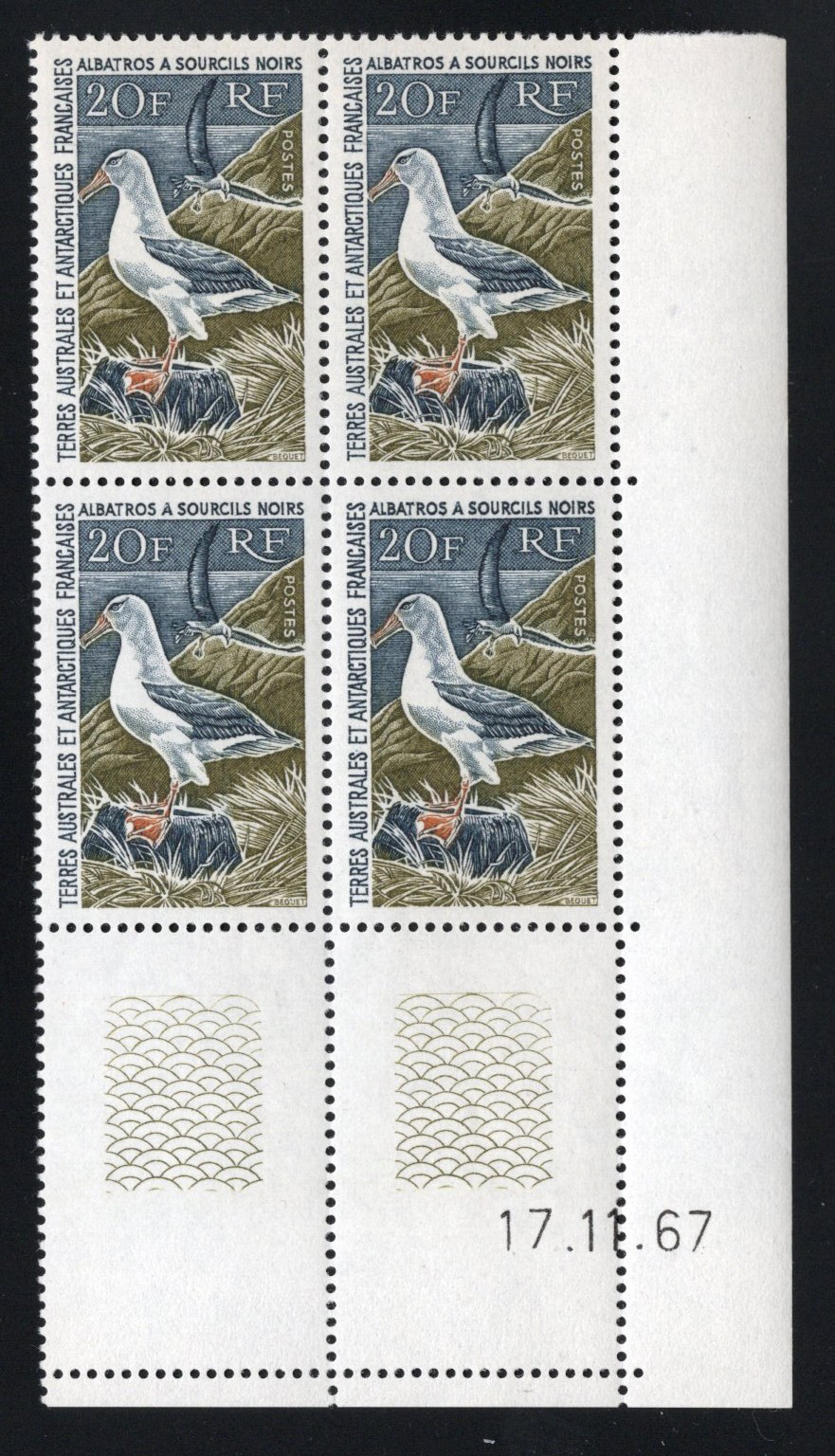 753 nh 28 image1967 20fr Black-Browed Albatros, a mint never hinged lower right corner plate block of four, with "17.11.67" print date, fresh and very fine. Catalogue value is for 4 single stamps only and gives no premium for the dated corner, which is quite scarce.